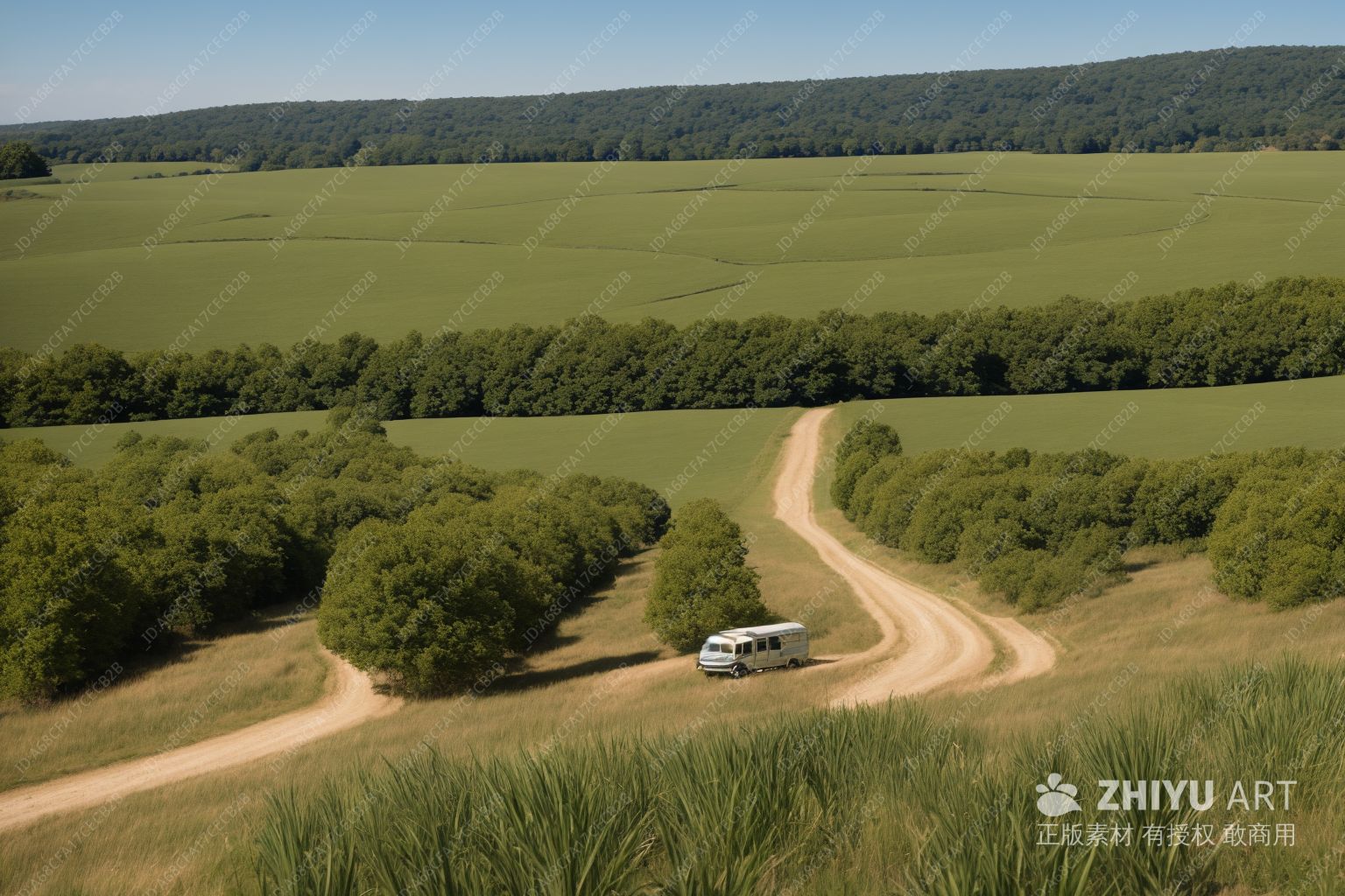 草地沐浴在阳光下,远处的山丘连绵起伏,点缀着树木。