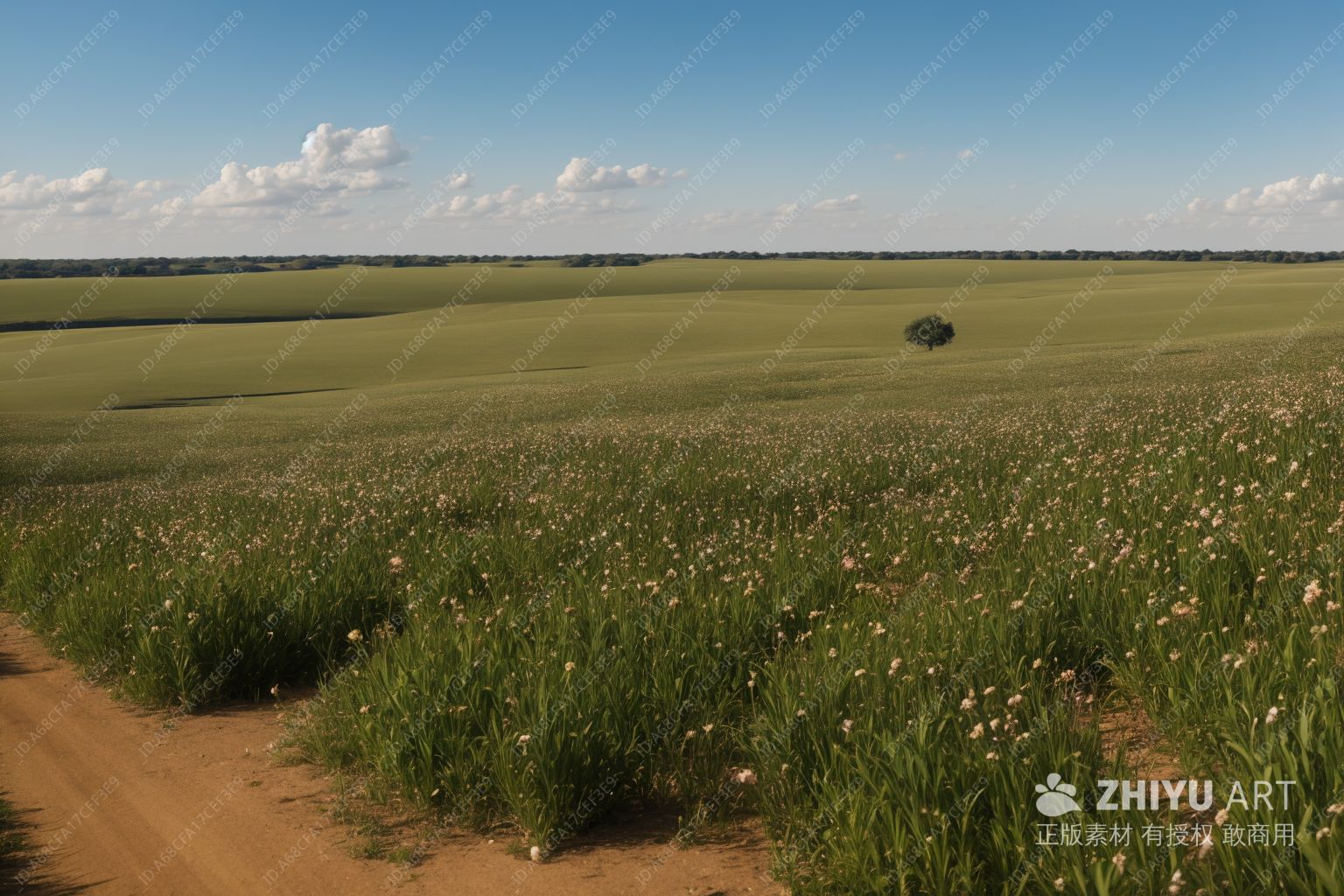 一片绿油油的田野,上面点缀着各种野花,天空湛蓝,飘