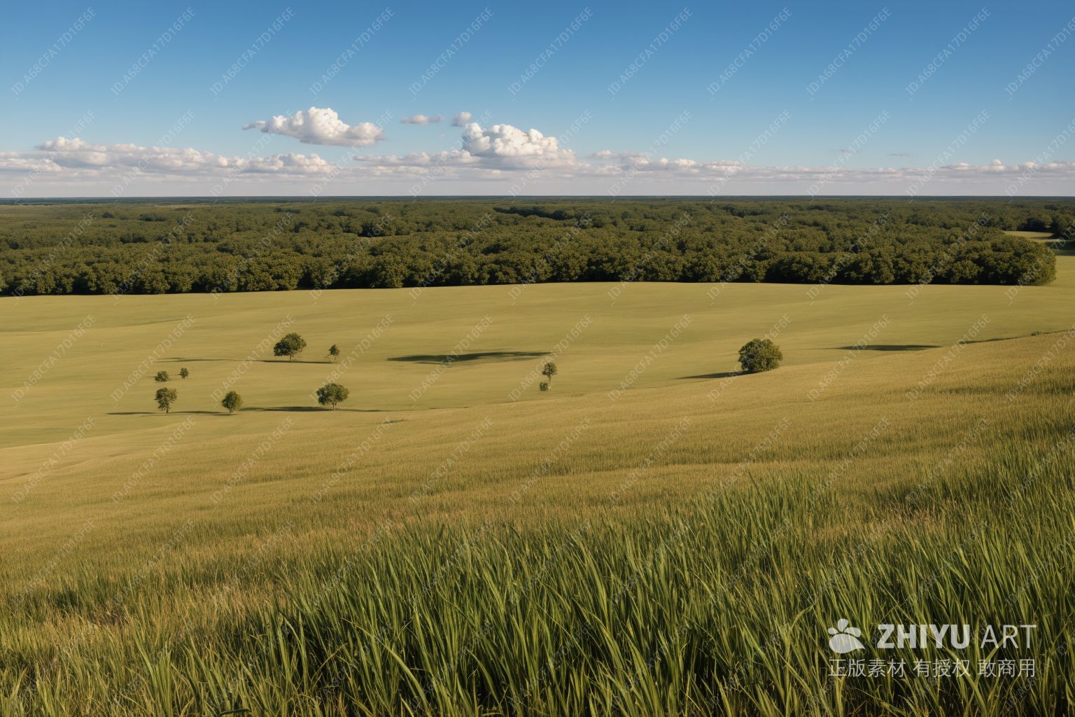广阔的田野上,绿色的山坡郁郁葱葱。天空呈现美丽的蓝