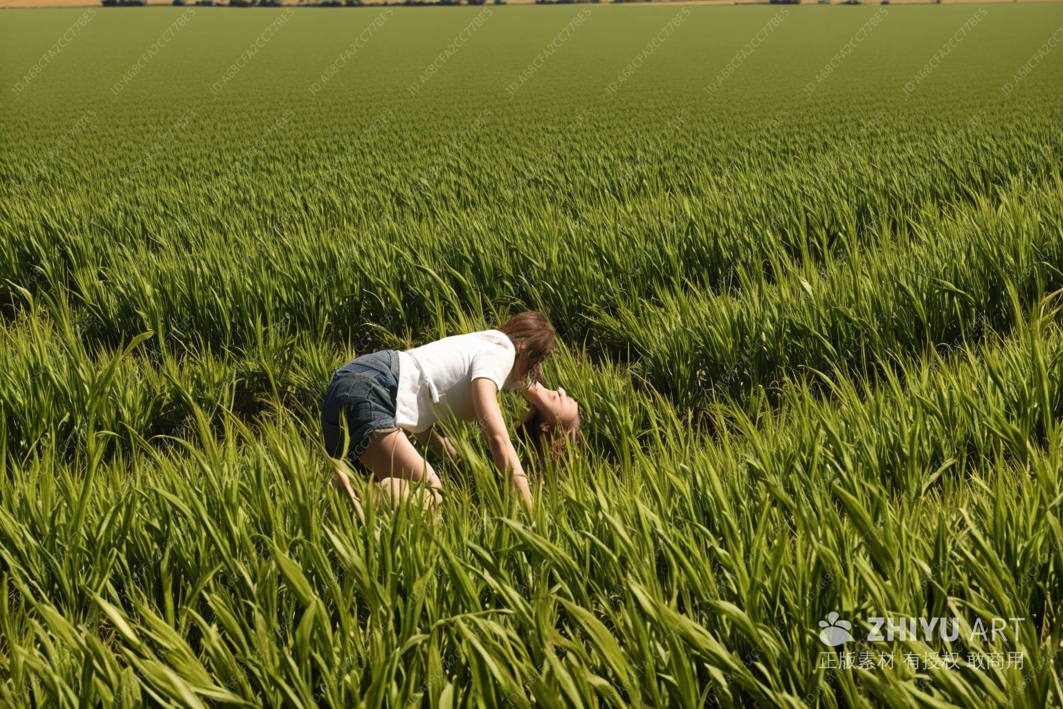 广阔的绿色田野占据了前景,上面点缀着干草堆。背景是