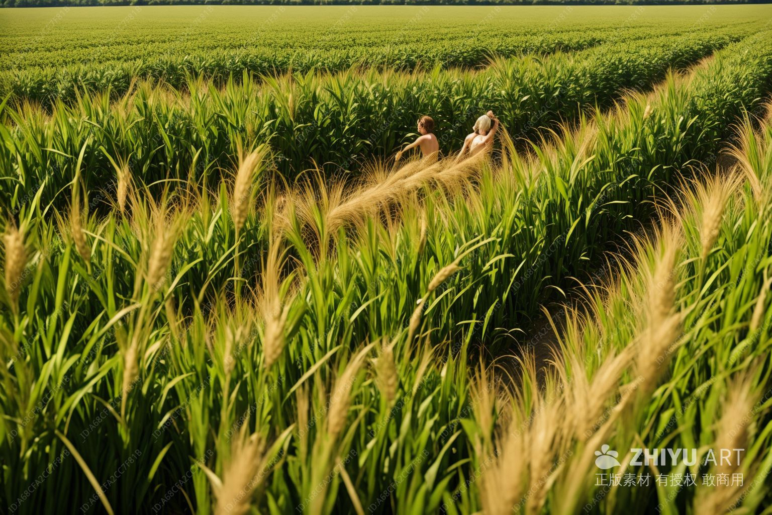 一片麦田,其中有高高的、干燥的草和秸秆。麦子呈现干