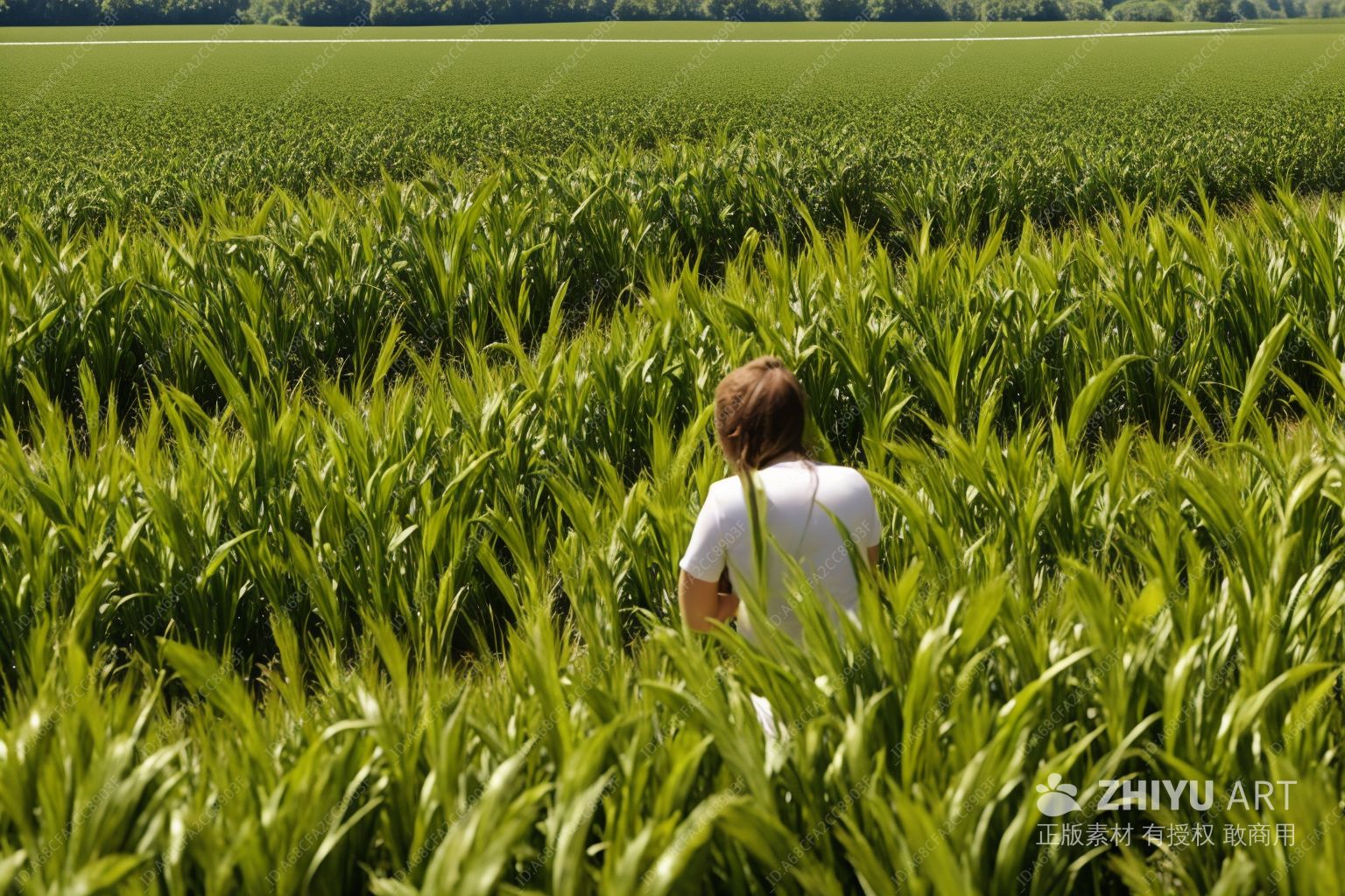 一片茂盛的绿色田野,长满了高而细长的正在生长的麦穗