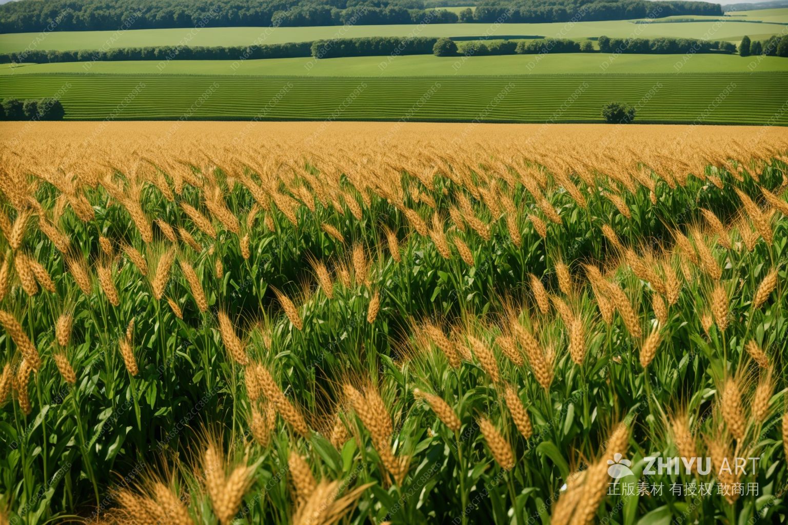 大片金黄色的麦田,麦穗饱满,在阳光下轻轻摇曳。远处