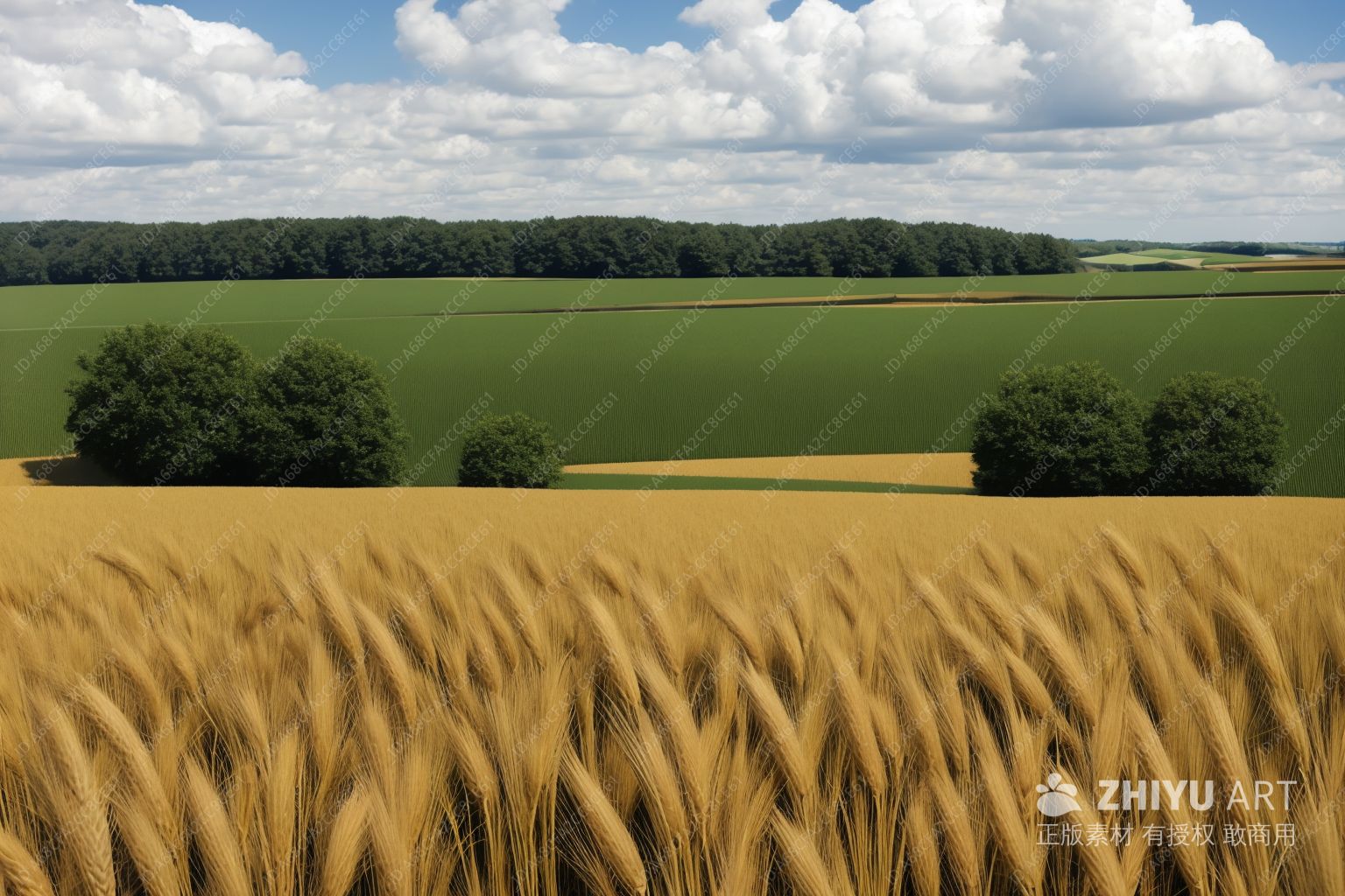 一片大麦田,金黄色的麦穗密集生长,远处的地平线与麦