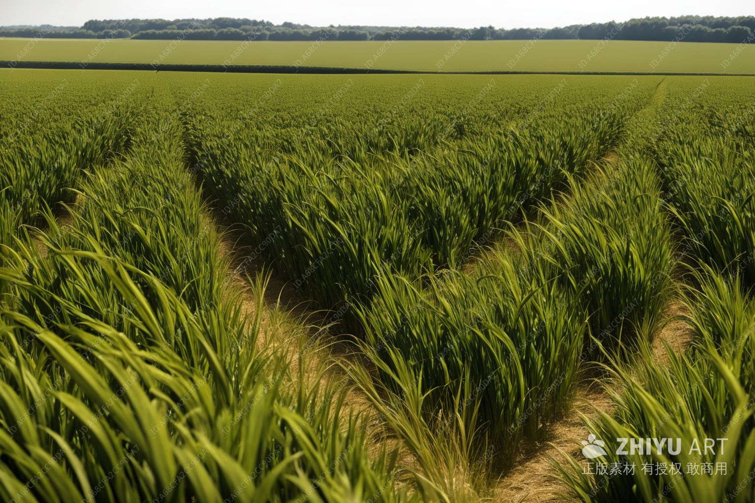 一片茂盛的绿色田野,长满了高而细长的正在生长的麦穗