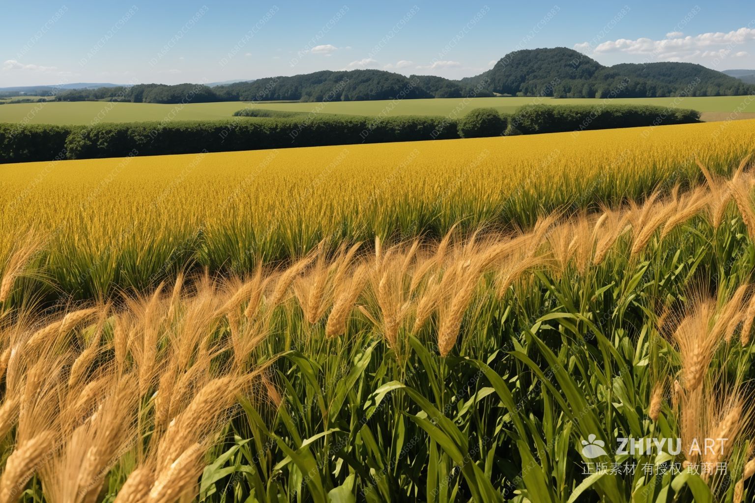 大片金黄色的麦田,麦穗饱满,在阳光下轻轻摇曳。远处