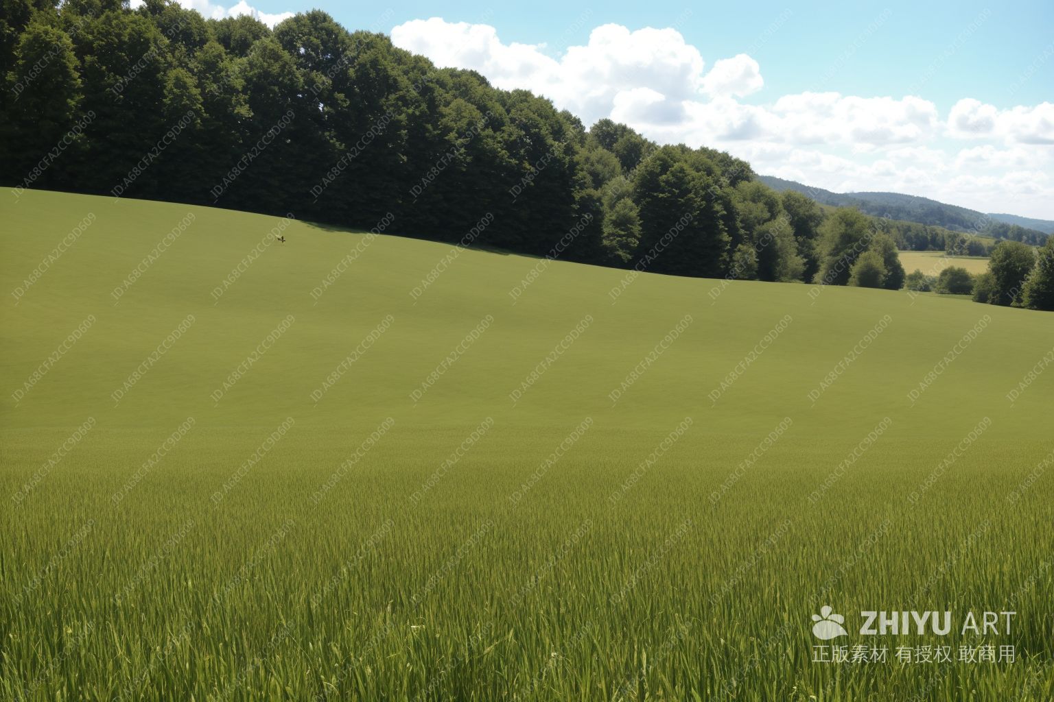 广阔的绿色田野占据了前景,上面点缀着干草堆。背景是