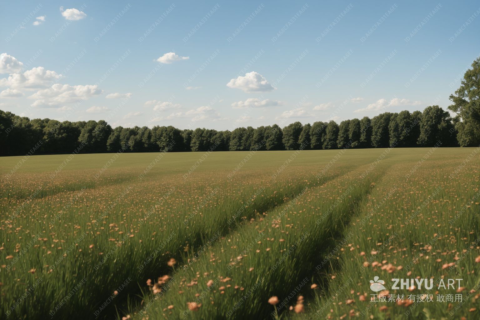 一片绿油油的田野,上面点缀着各种野花,天空湛蓝,飘