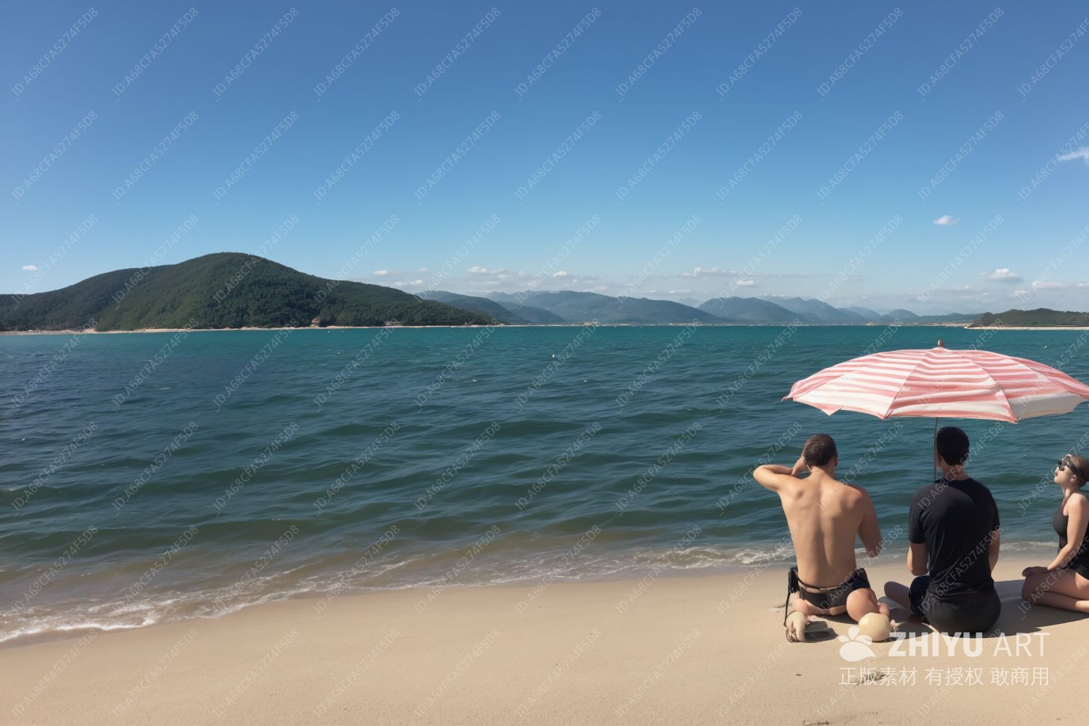 一片沙滩,海浪轻柔地拍打着海岸。海面广阔,呈现蓝色