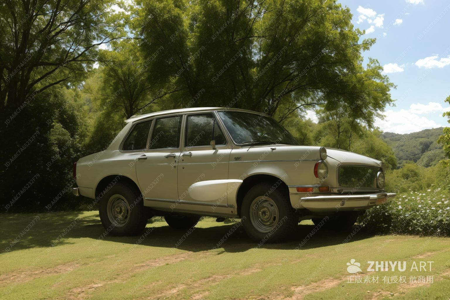 一辆银色经典汽车停在森林边缘,阳光洒在车身上。森林