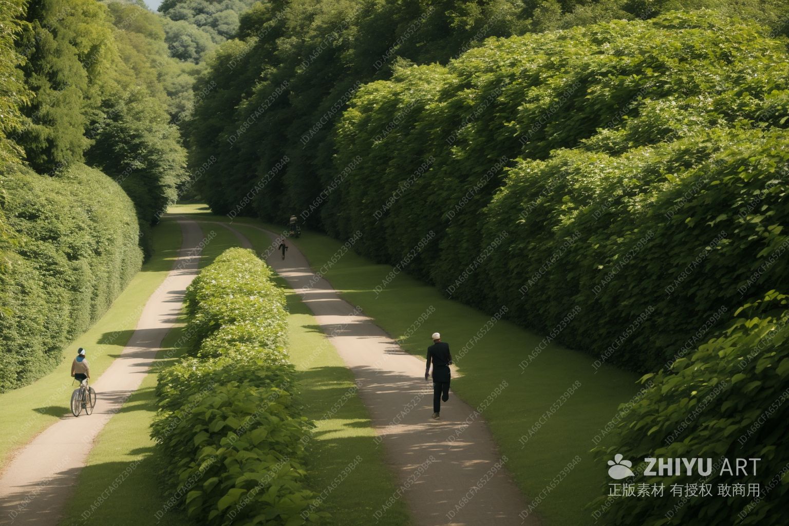 两条小路向前延伸,路的尽头沐浴在阳光下。路的两旁生