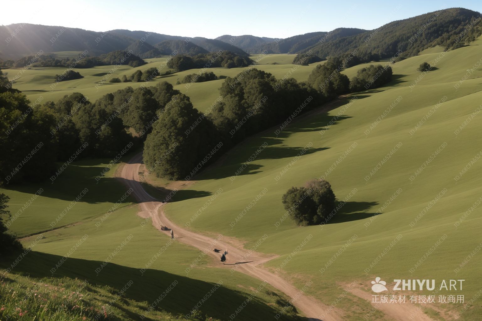 蜿蜒的道路被树木环绕,营造出一种深度感和宁静感。道
