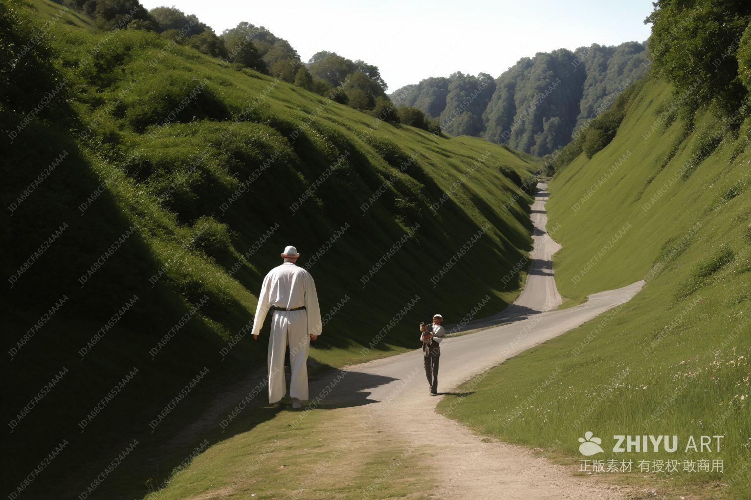 一位老人拄着拐杖走在小路上,头上戴着遮阳帽。周围是