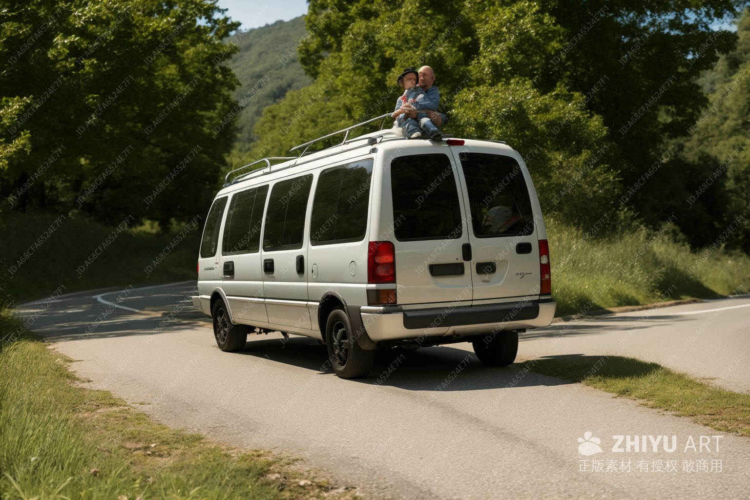 一辆汽车行驶在道路上,道路两旁是茂密的绿色森林。画