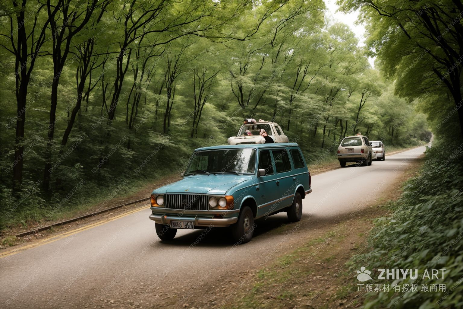 一辆汽车行驶在道路上,道路两旁是茂密的绿色森林。画