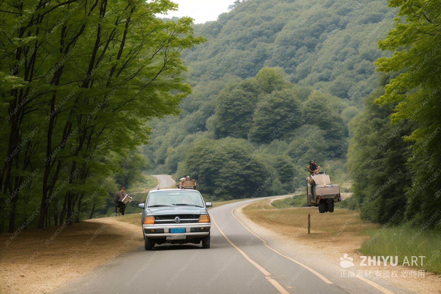 蜿蜒的道路被树木环绕,营造出一种深度感和宁静感。道