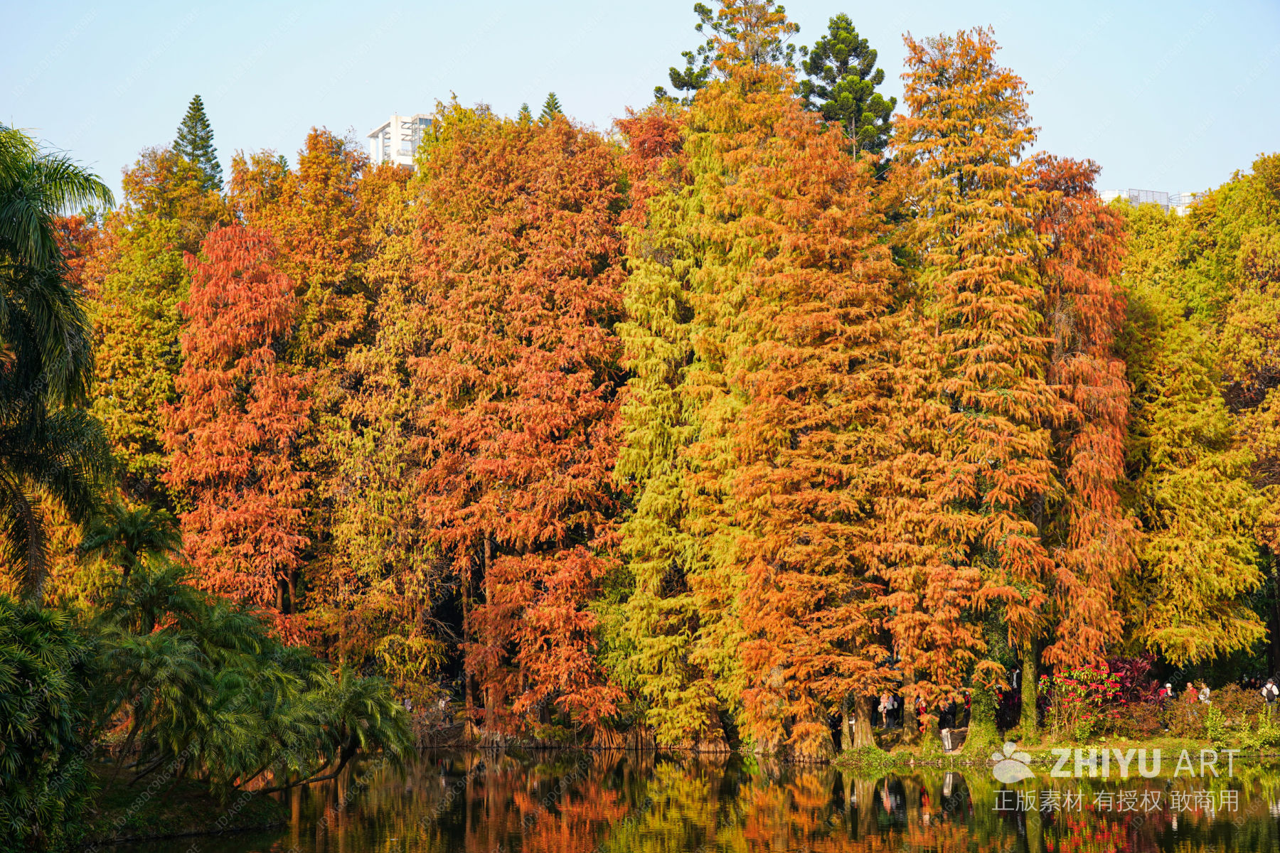 深水湖面波光粼粼,环境空旷。阳光明媚的秋日,湖边生