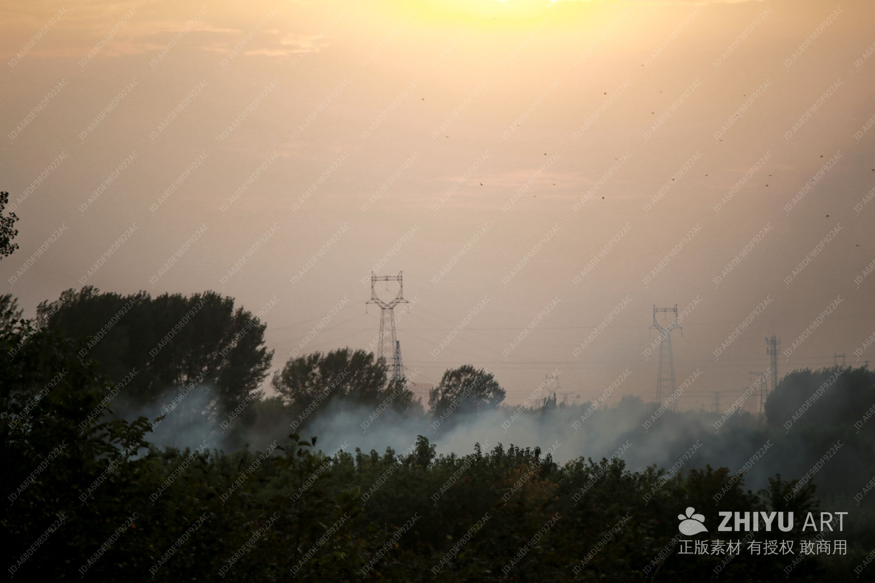 黄昏 烟雾 高压电塔 树木 飞鸟 宁静 环保 自媒体场景 地平线 霞 霾 日出 朝霞 日落 日出日落 雾 薄雾 晚上 白天 太阳 树 自然景观
