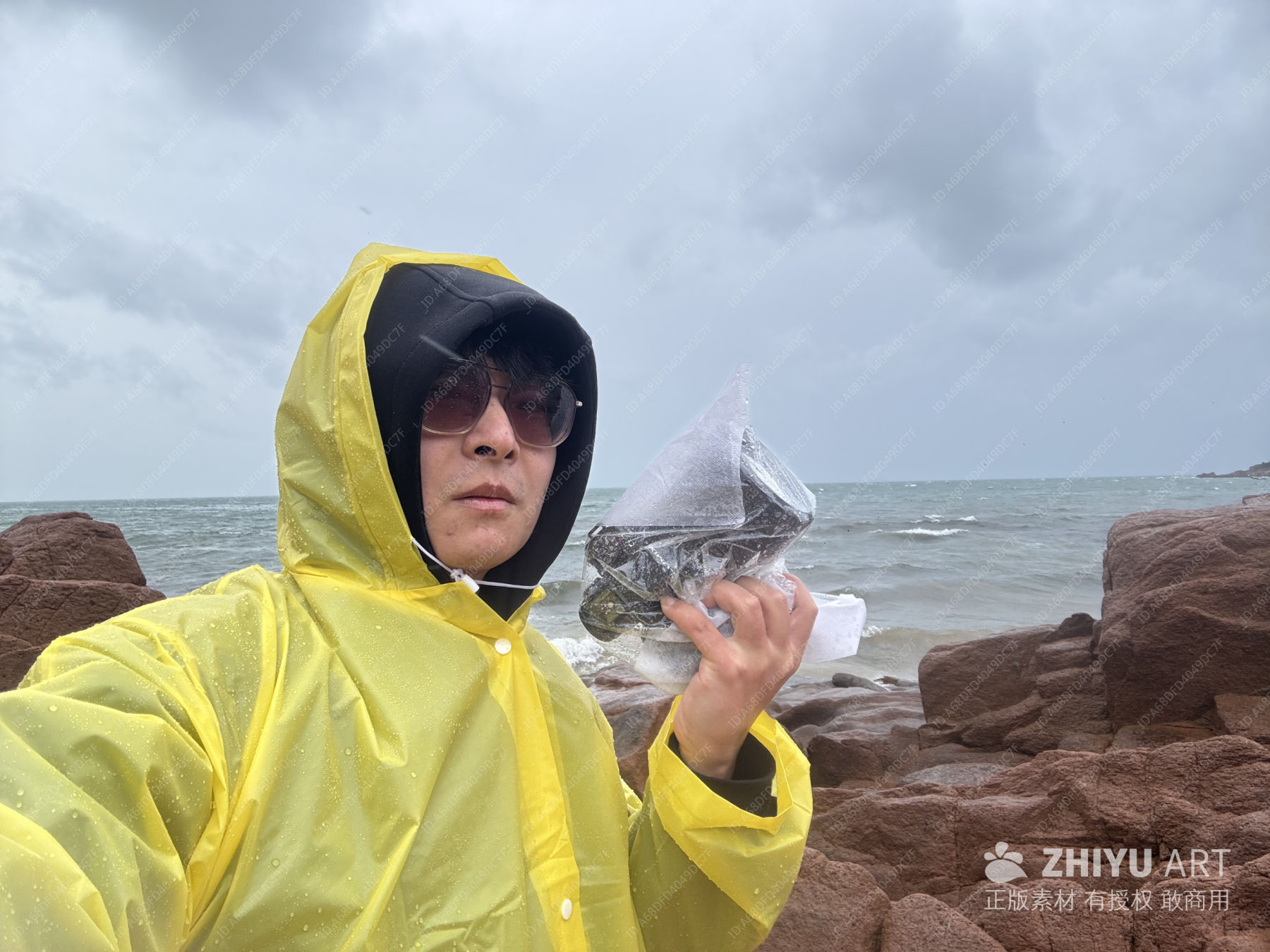 海边 雨衣 墨镜 岩石 阴天 防水袋 户外 自然 旅行 生活记录 外套 服装 黄色 海洋 兜帽 人像 连帽衫 人 颜色 自然景观