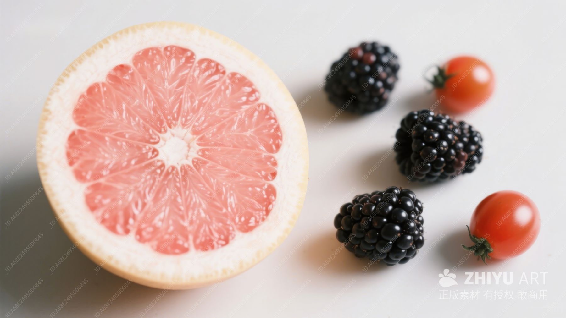 切开的葡萄柚,展示鲜艳红色果肉 373