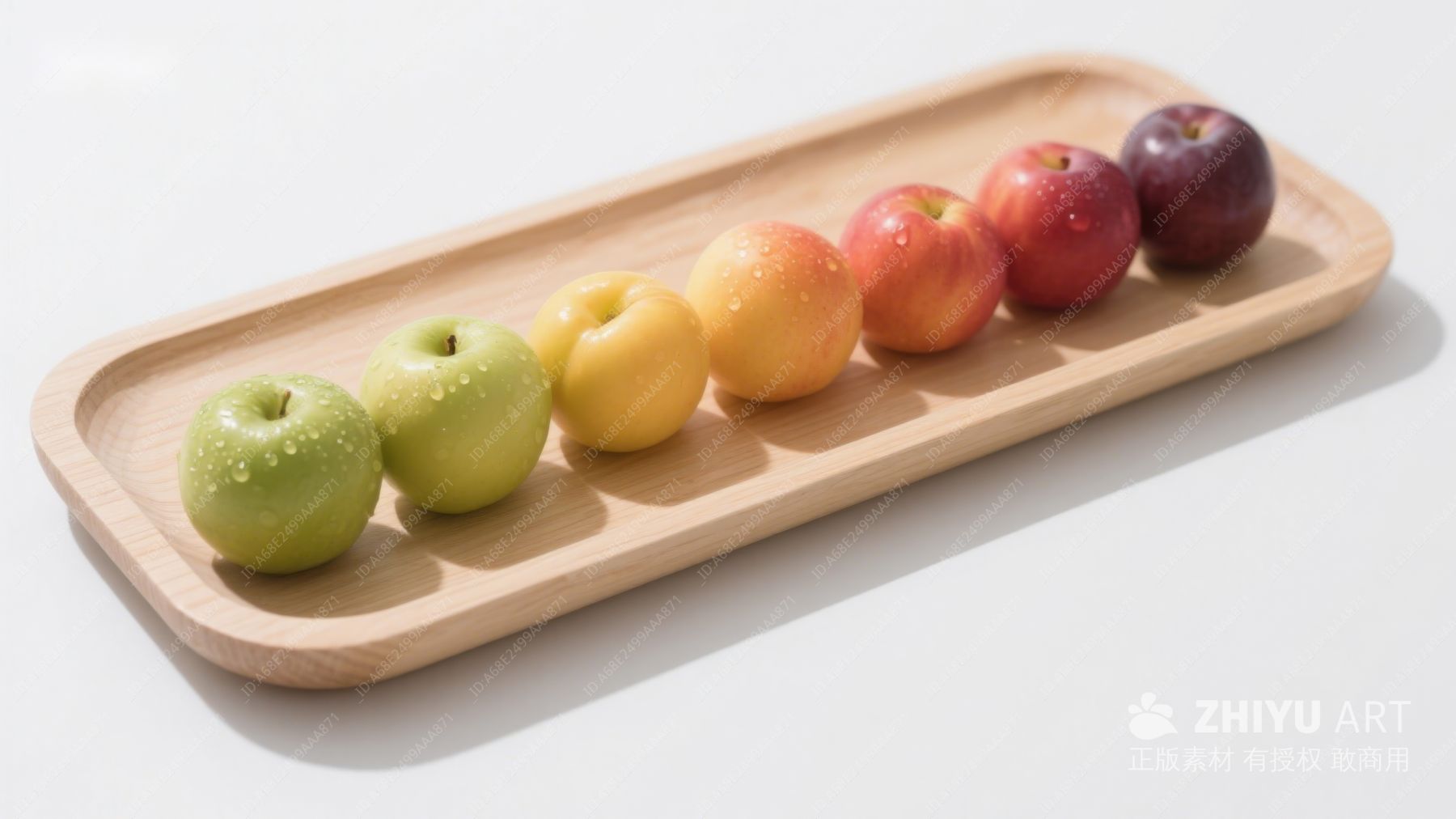色彩渐变的水果排列在木质托盘上 427