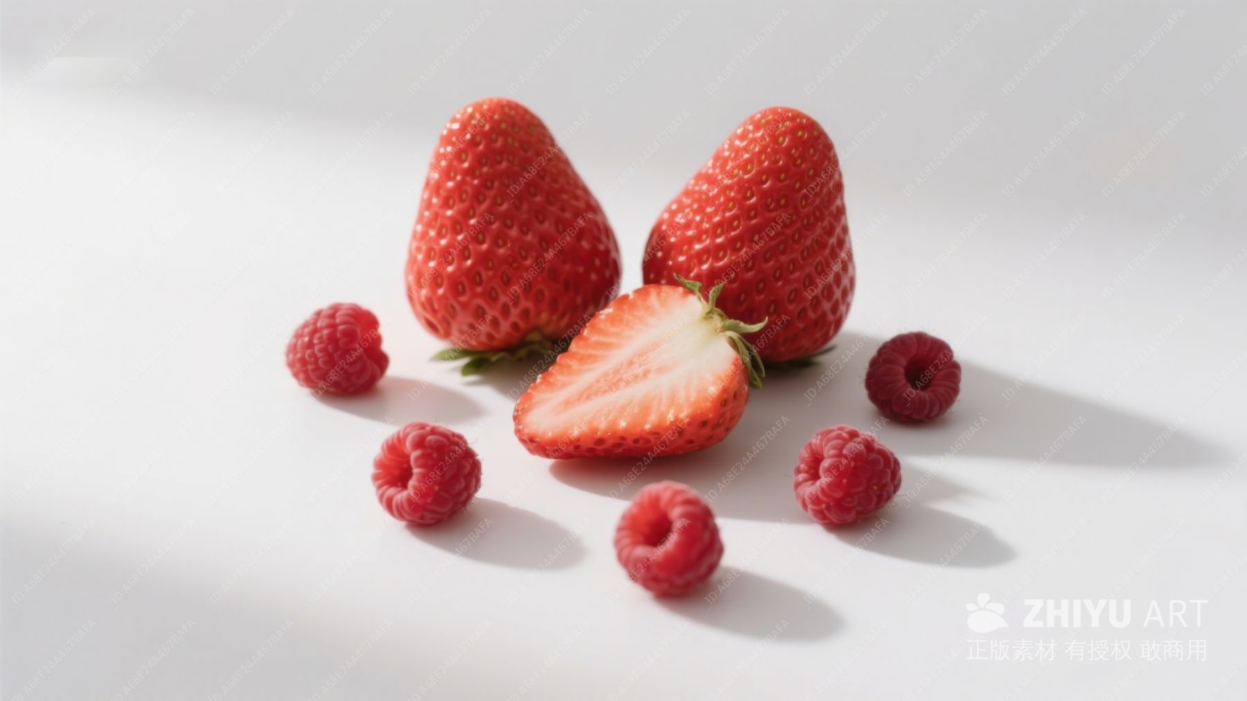 新鲜草莓与覆盆子散落白背景