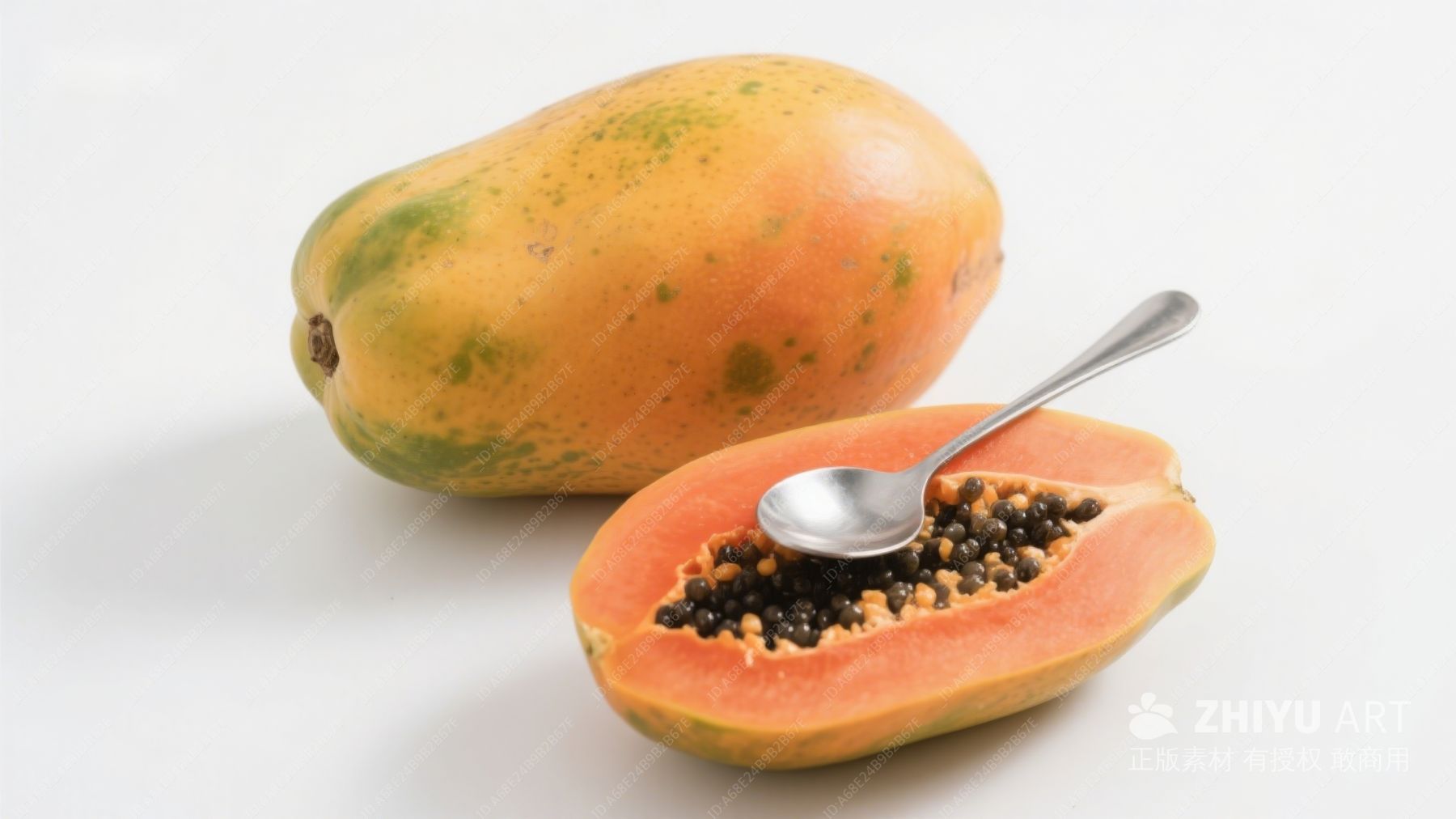 新鲜木瓜切半展示,勺子舀取籽粒 767