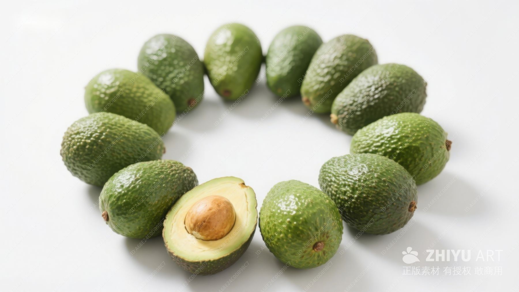新鲜牛油果围成圈,一半切开展示果肉 843