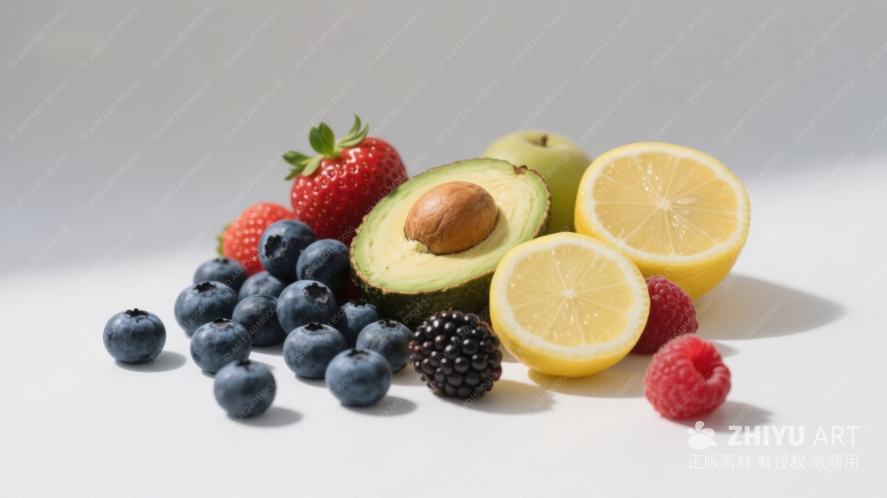 新鲜水果组合:蓝莓、草莓、柠檬与牛油果