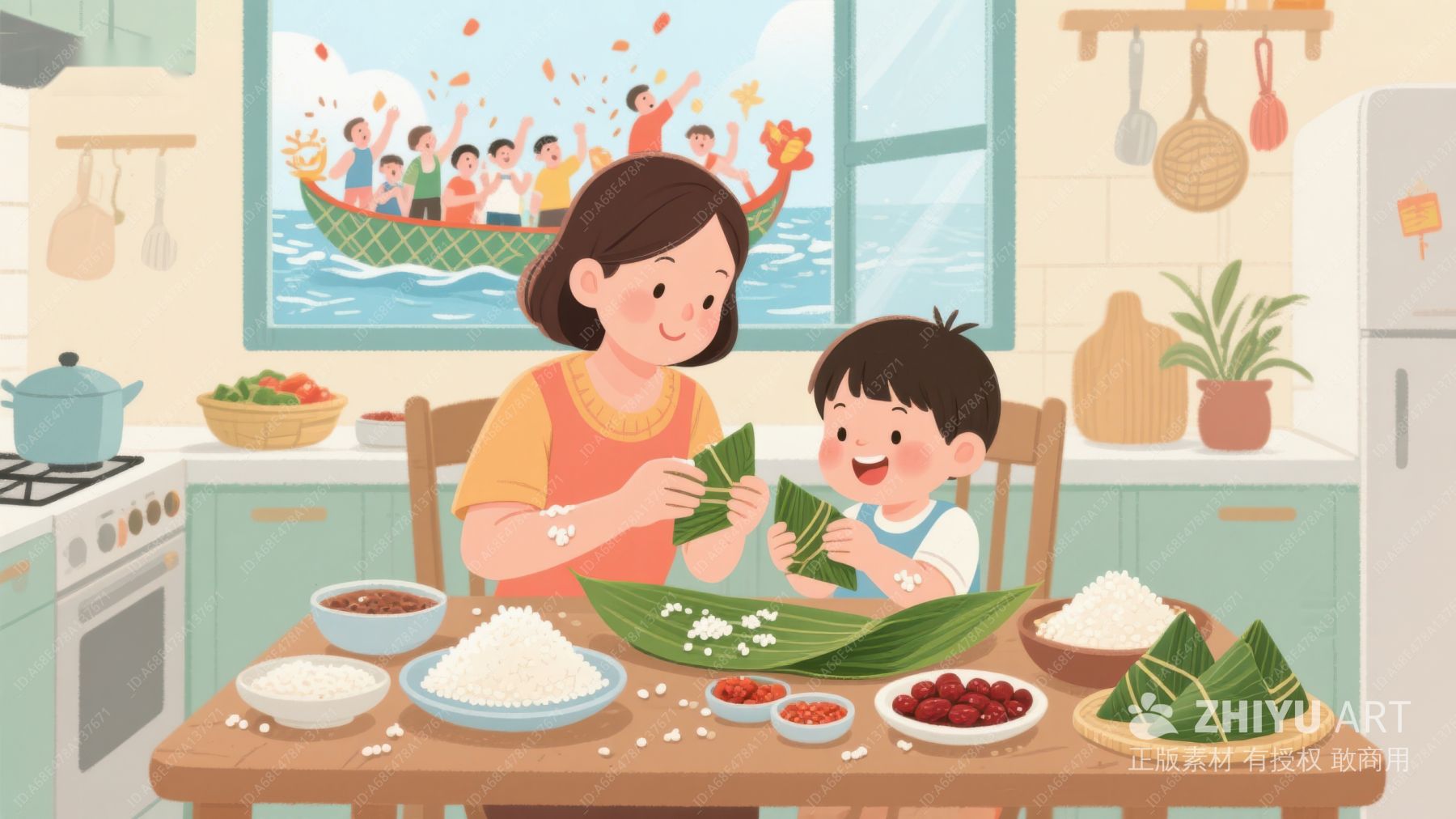母子厨房包粽子,窗外龙舟赛热闹 357