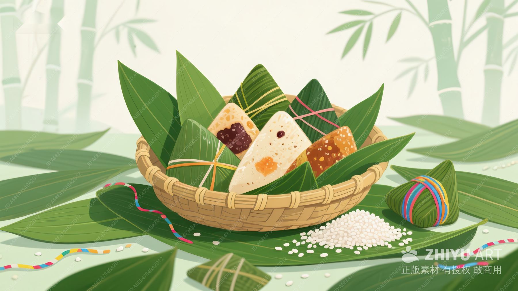 竹篮中的粽子与竹叶装饰 471