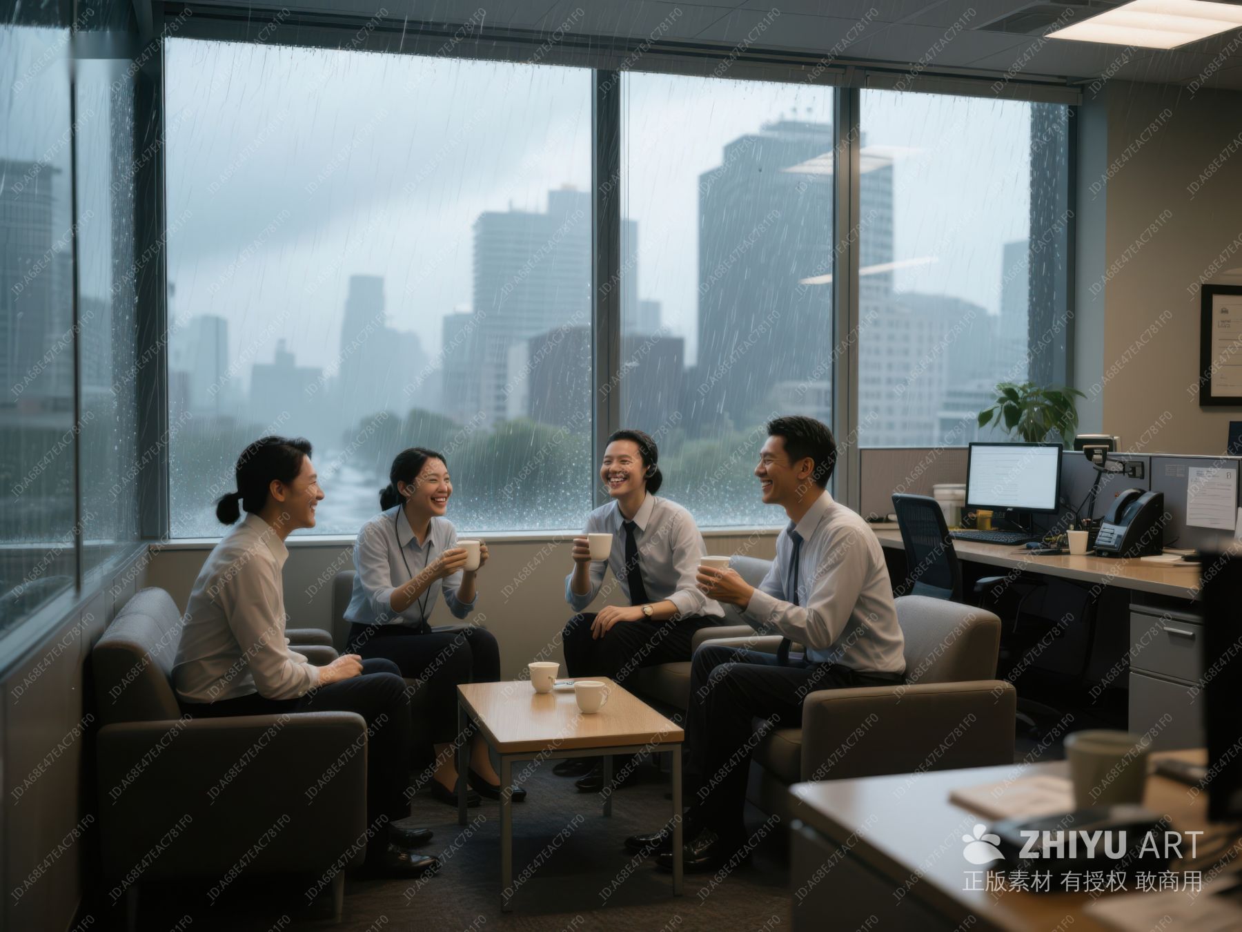 在明亮的光线下,一群身着商务服装的人站在办公室里。