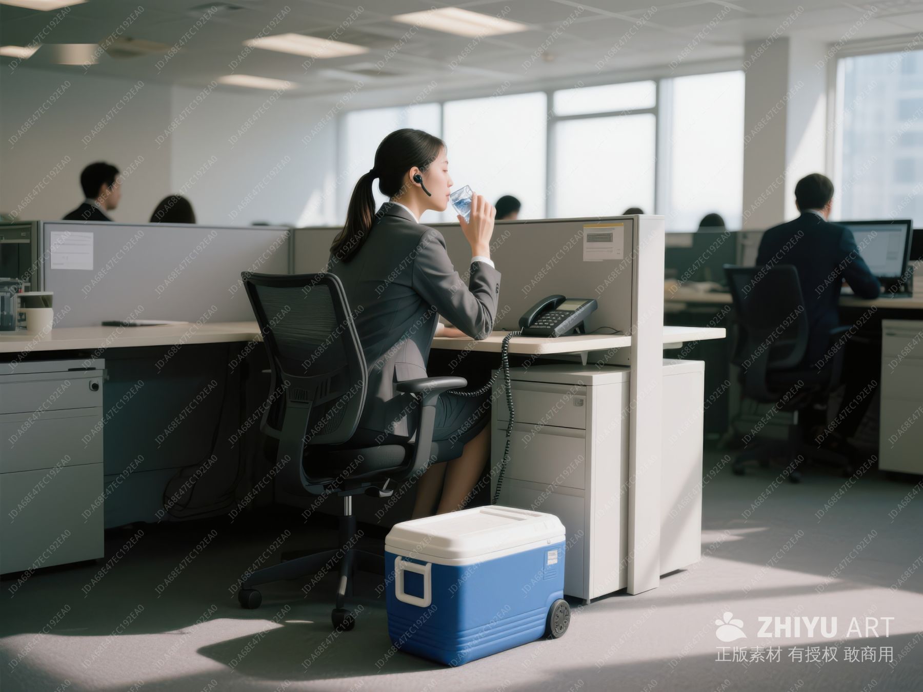 一位穿着蓝色衬衫和裙子的女士坐在办公室里,手里拿着