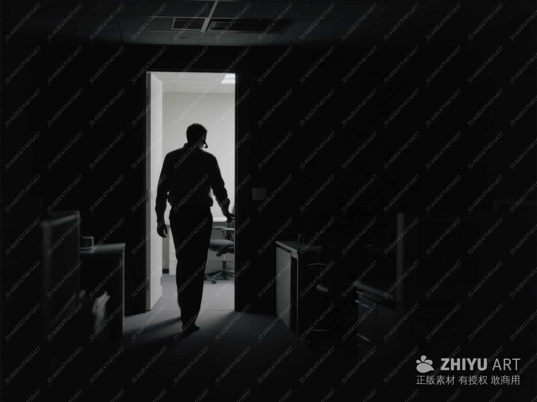 黑白图像中,一个男人站在一条黑暗走廊的尽头。他正凝