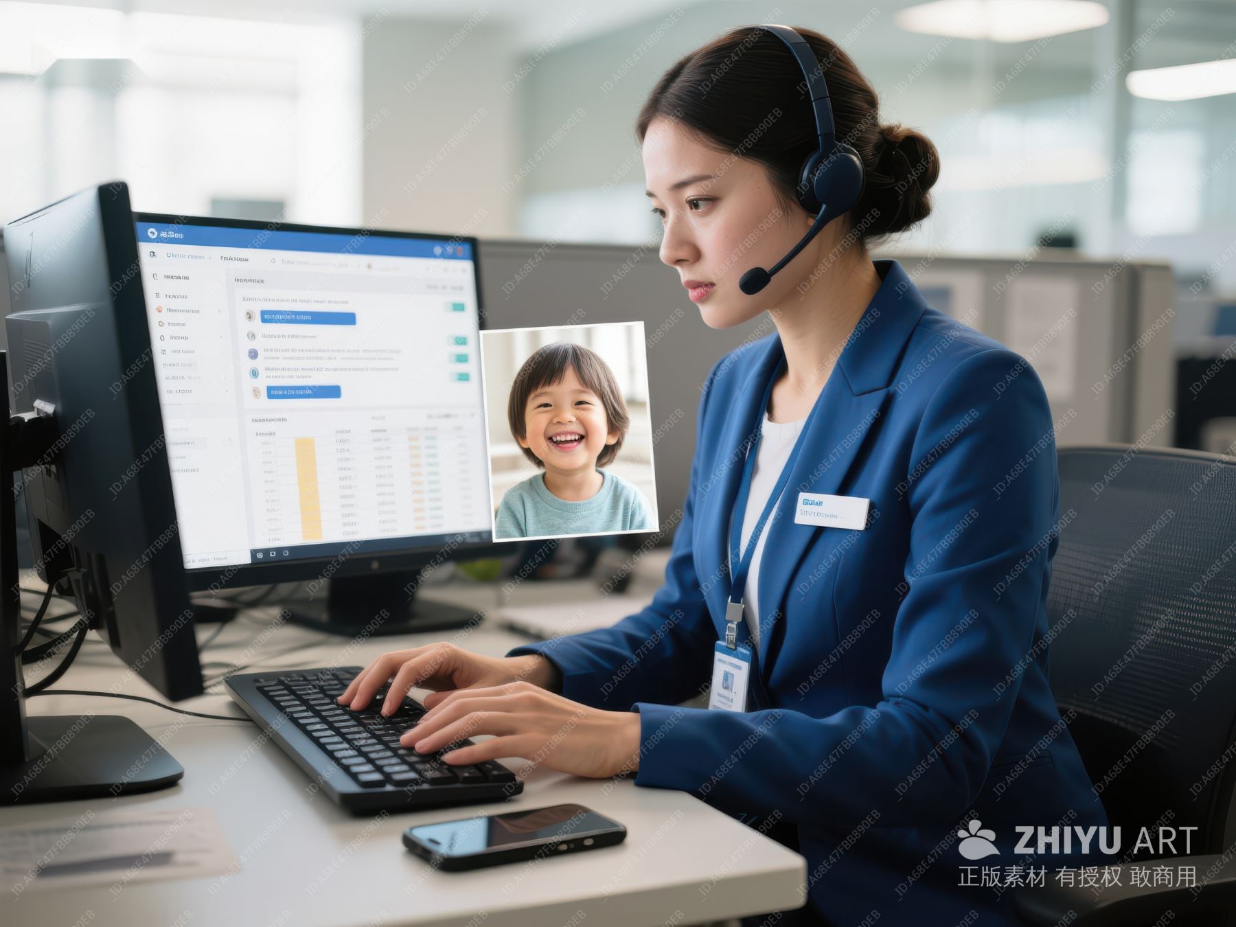 客服人员专注工作,屏幕显示儿童笑脸 229