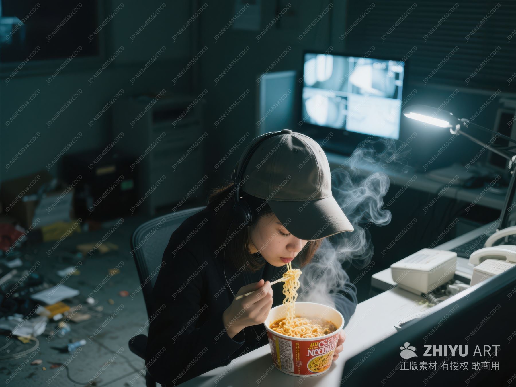 深夜办公,女子专注享用热气腾腾的泡面 335