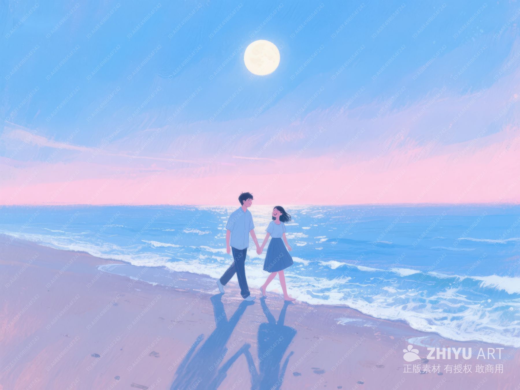情侣海边漫步,夕阳映照波光 520
