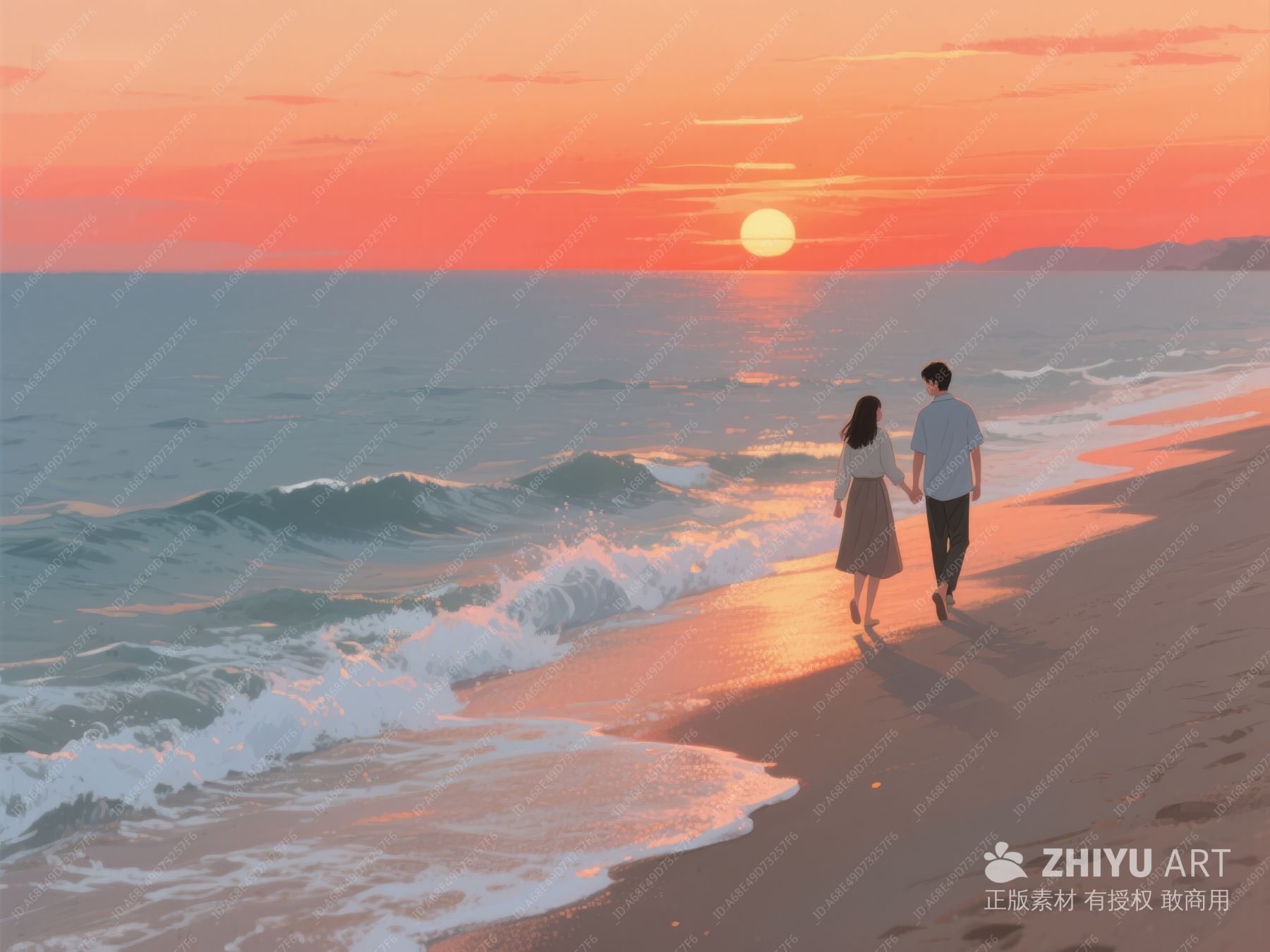情侣海边漫步,夕阳映照浪漫时刻 537