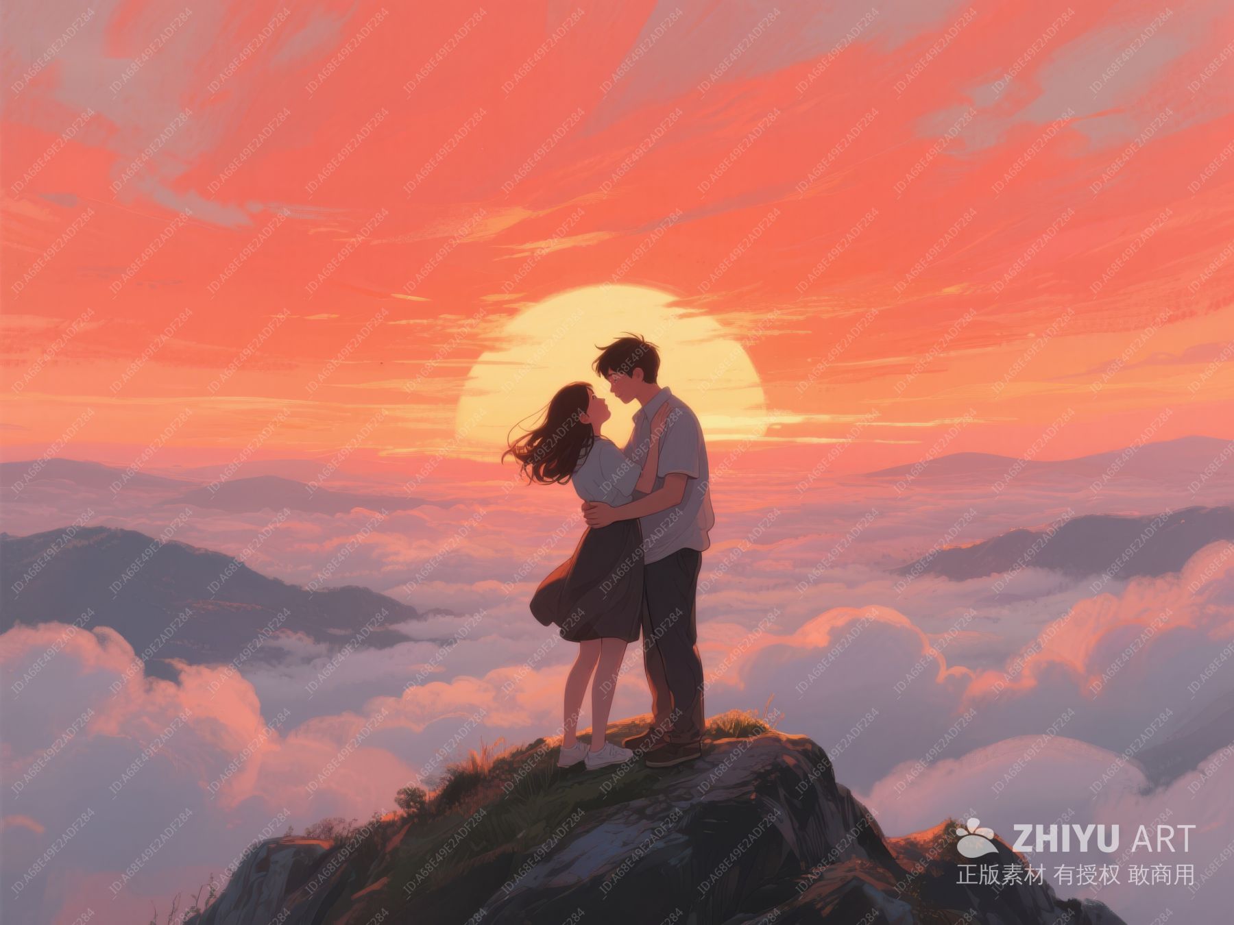 山顶情侣拥抱,夕阳云海背景 657