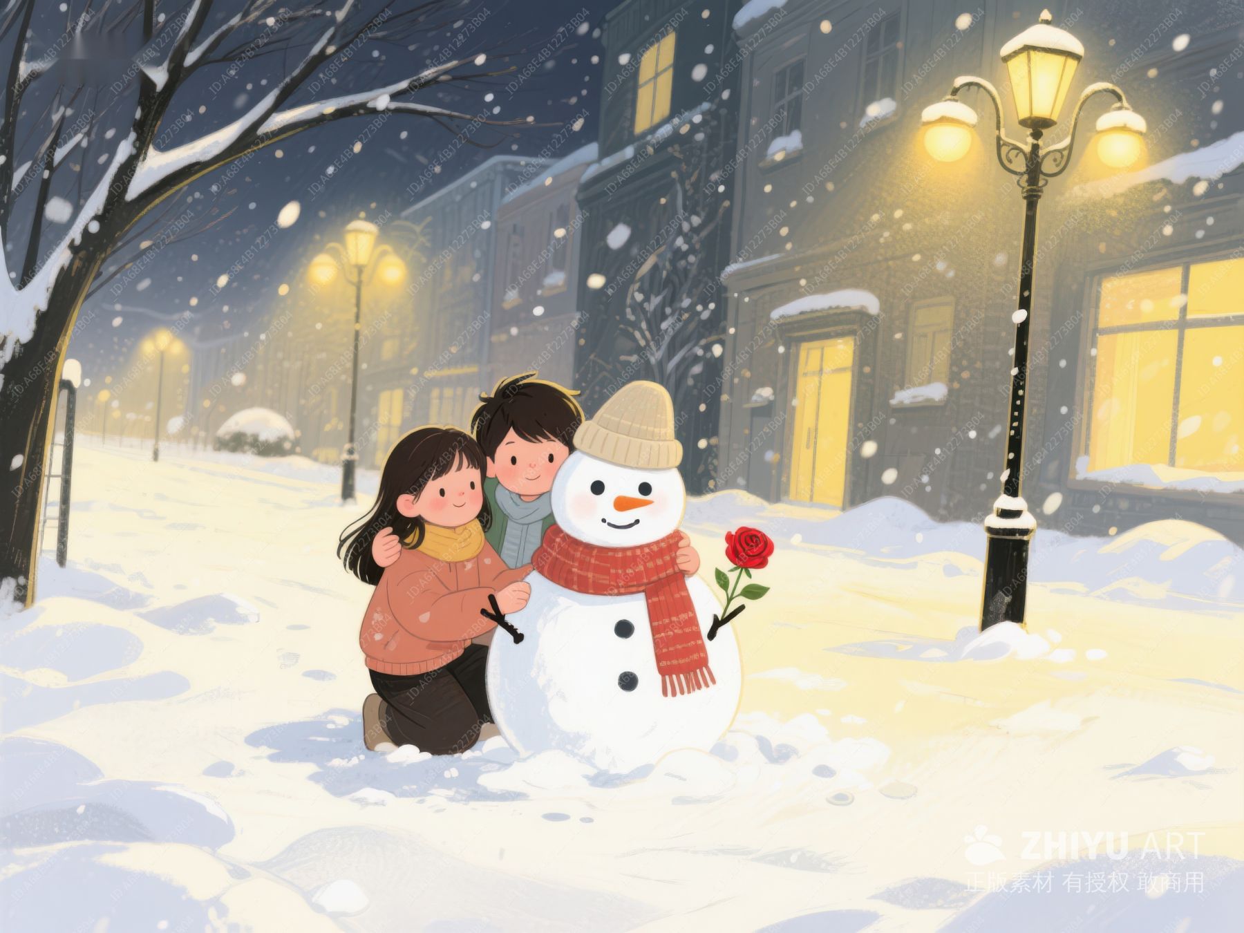 冬夜雪景中孩子们与雪人欢庆节日 137