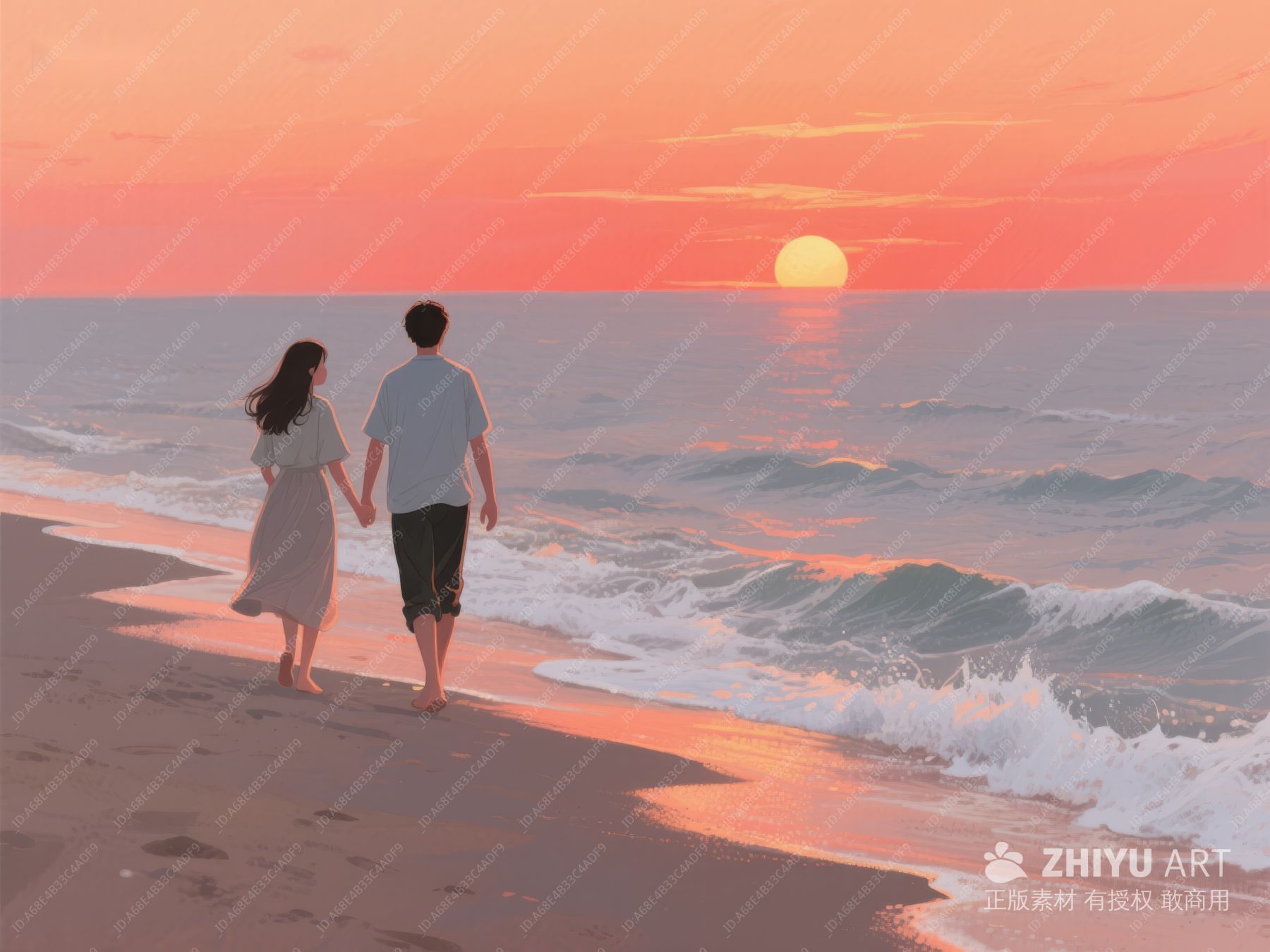 情侣海边漫步,夕阳映照浪漫时刻 502