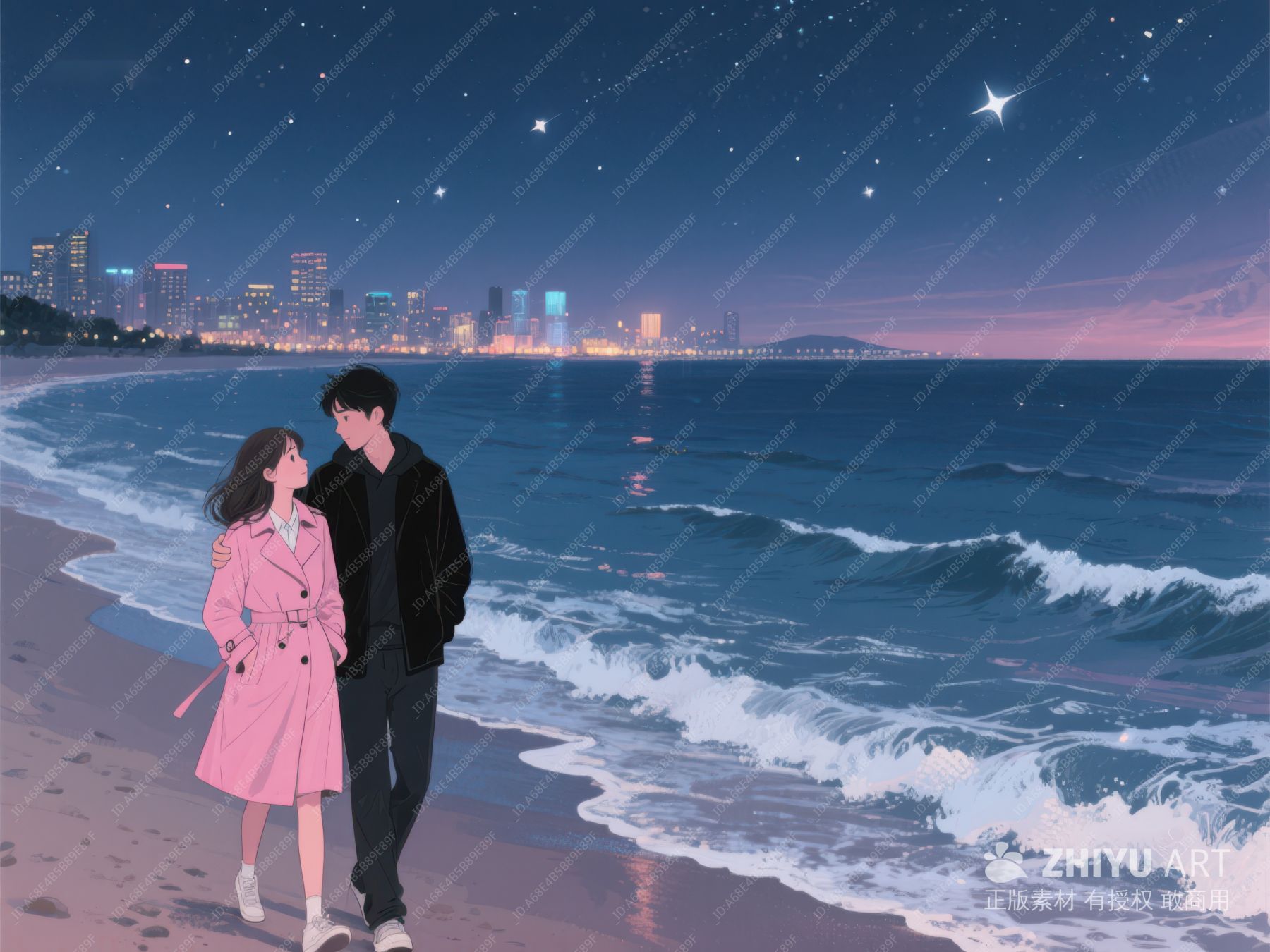 情侣海边漫步,夕阳映照浪漫时刻 537