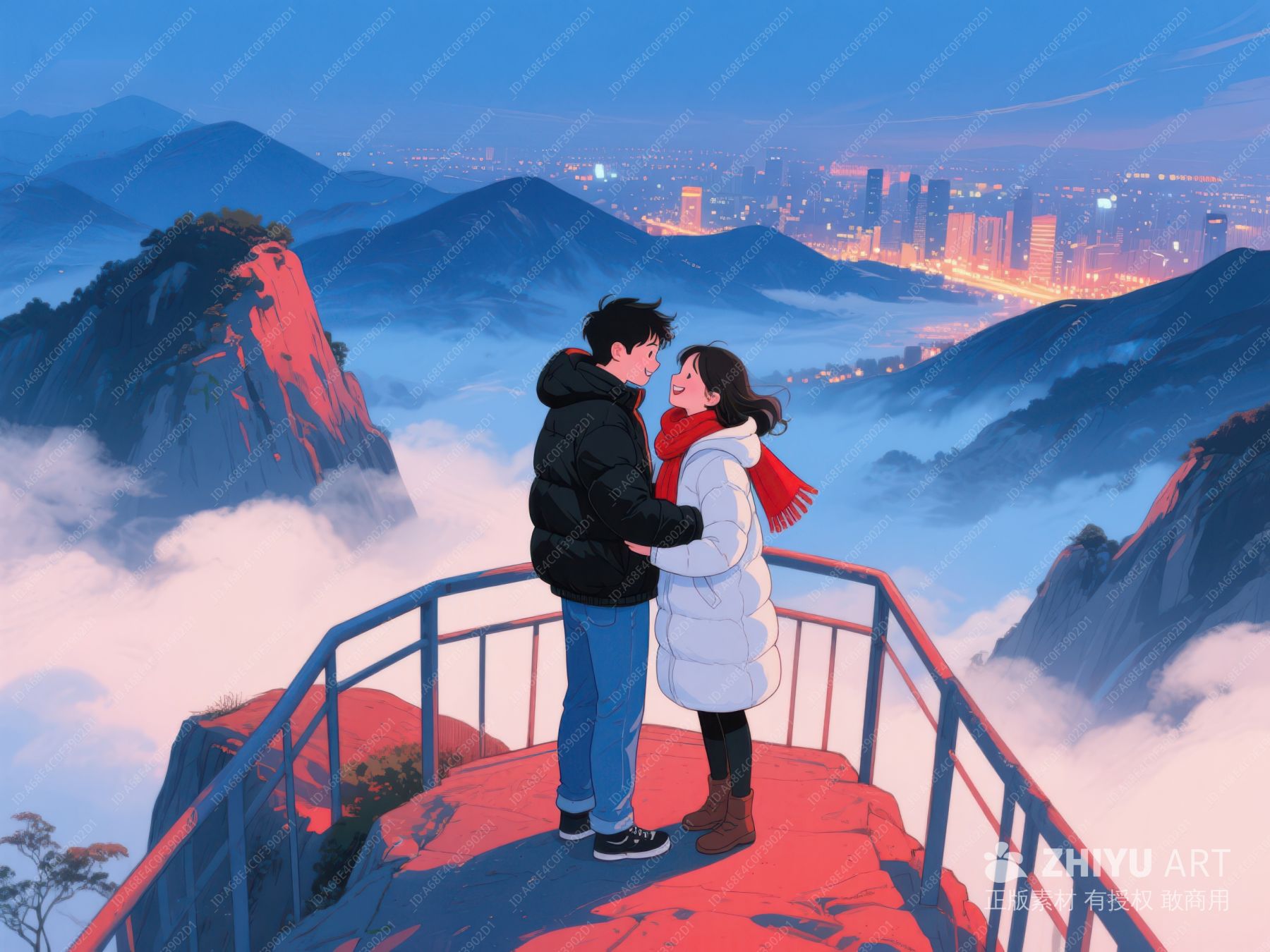 山顶情侣俯瞰城市夜景 623