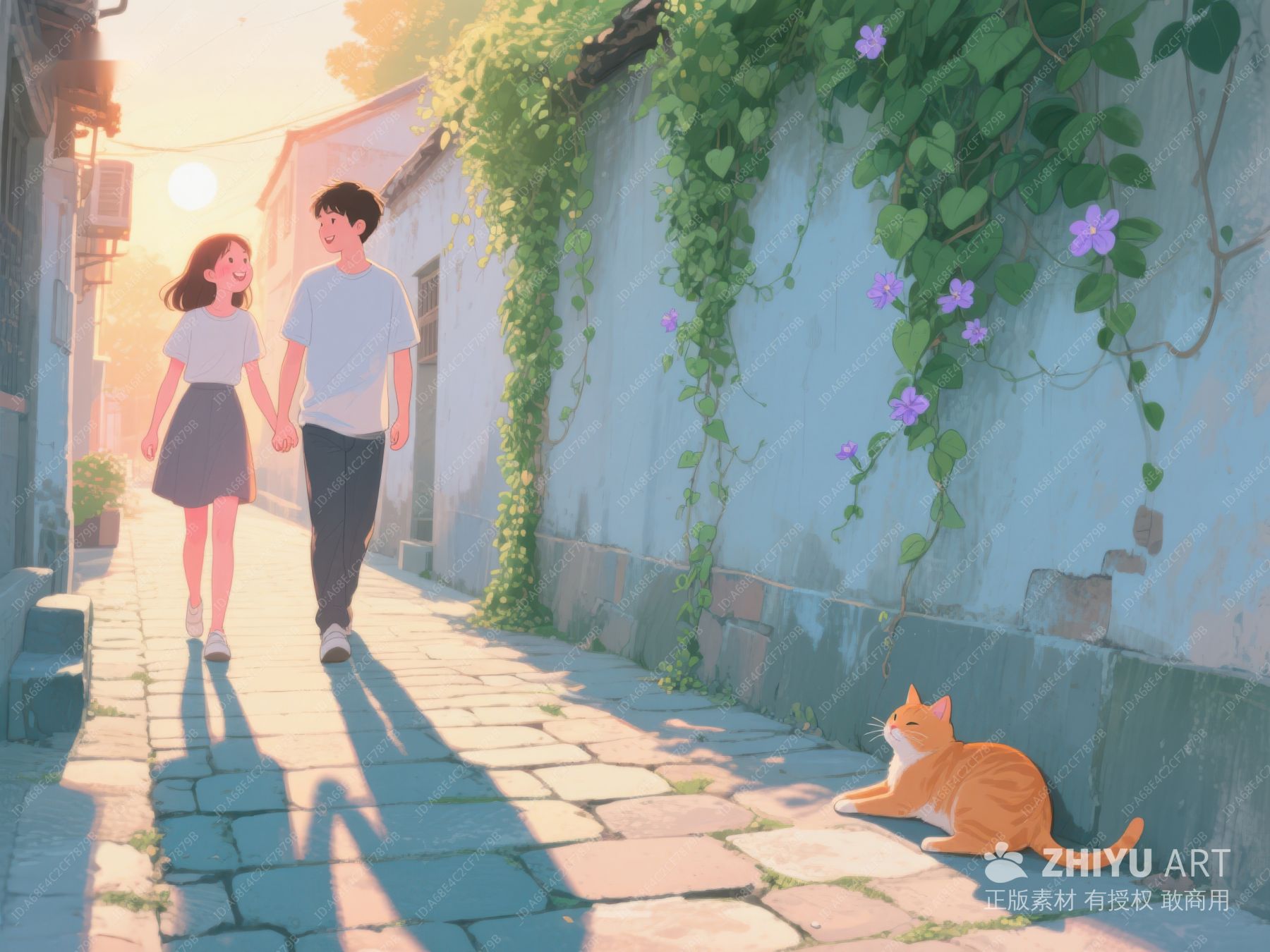 情侣漫步古街,阳光洒满青石路 533