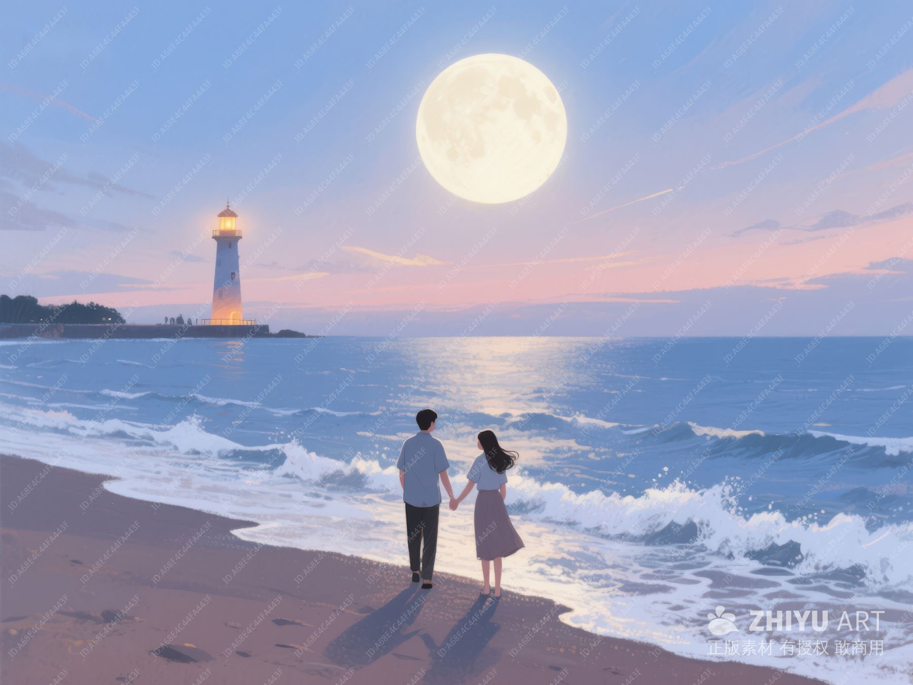 月下情侣海边漫步,远处灯塔闪烁 1121