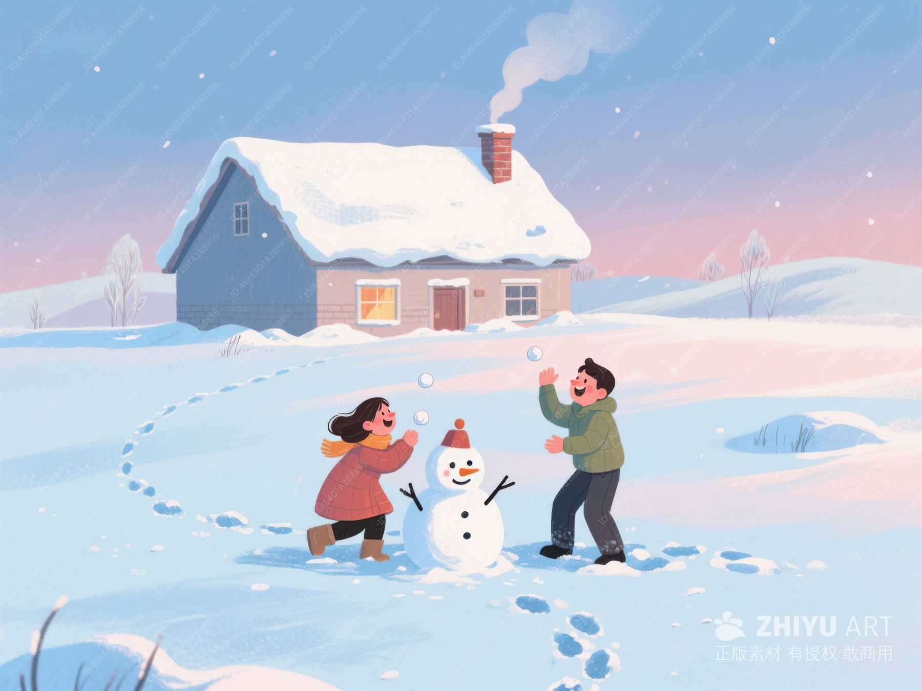 冬日雪景中,两人堆雪人嬉戏 95
