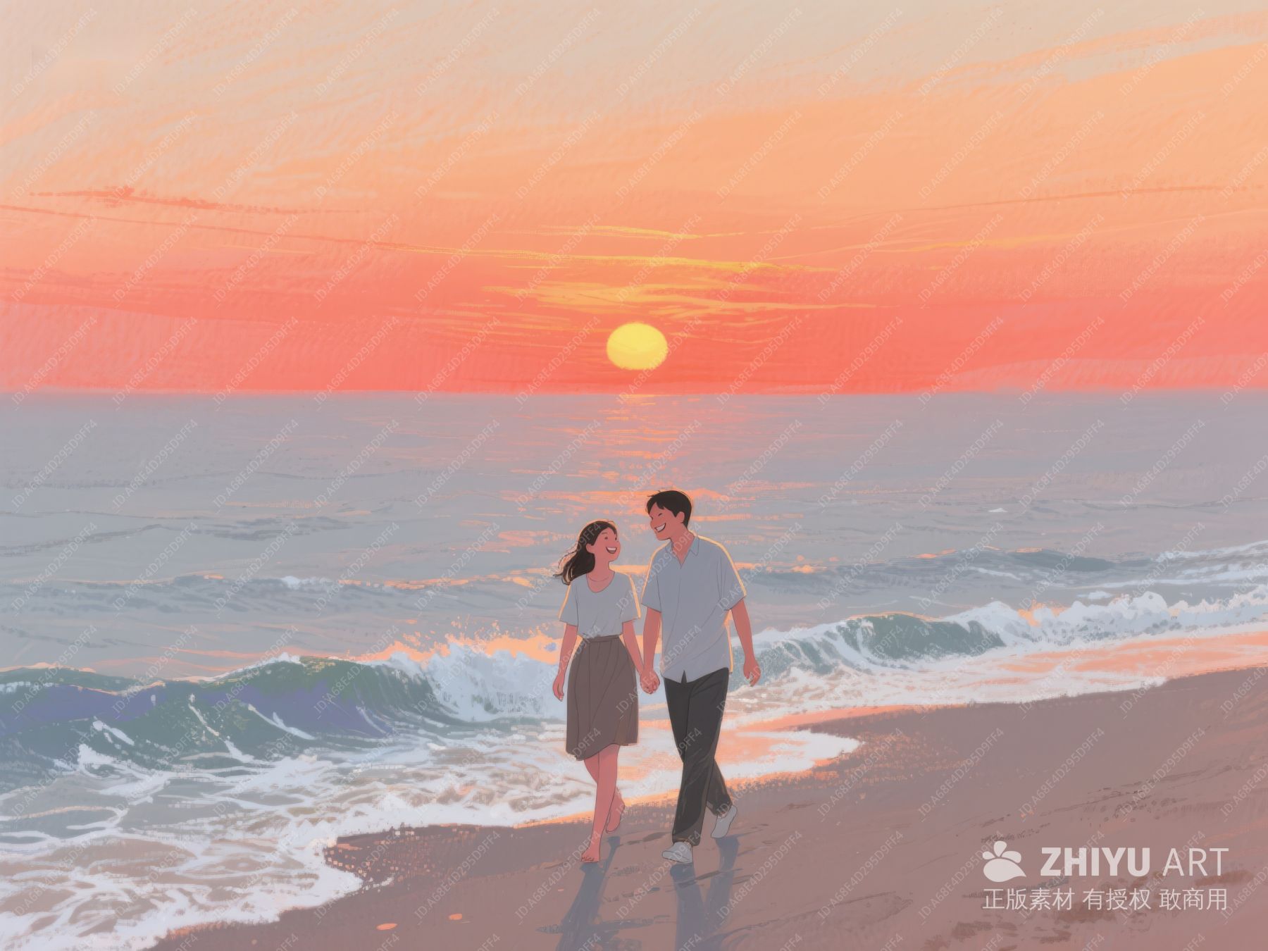 情侣海滩漫步,夕阳映照浪漫时刻 509