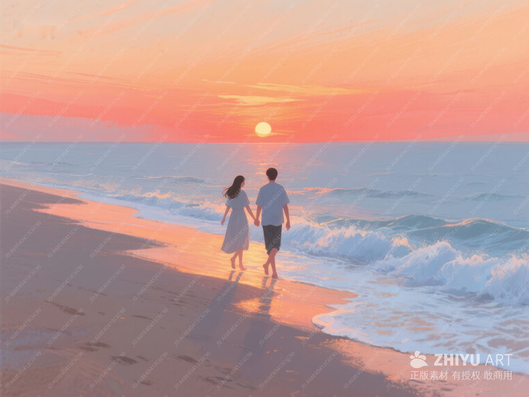 情侣海边漫步,夕阳映照浪漫时刻 522