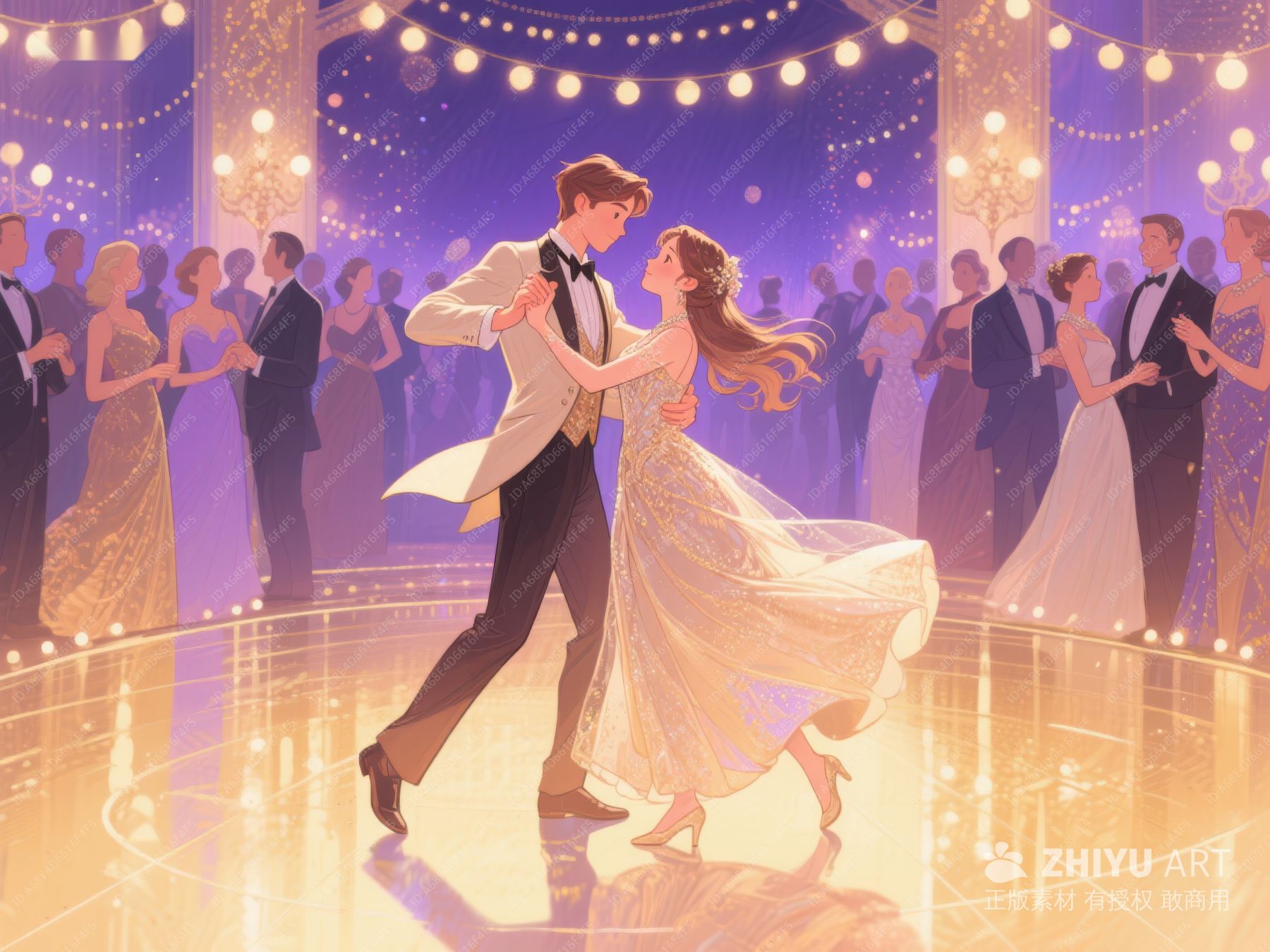 身着礼服的年轻男子与一位身穿礼服的年轻女子在舞池中