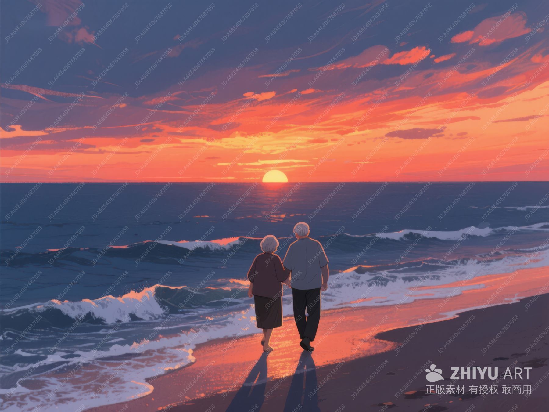 夕阳下漫步海滩的老年夫妇 879